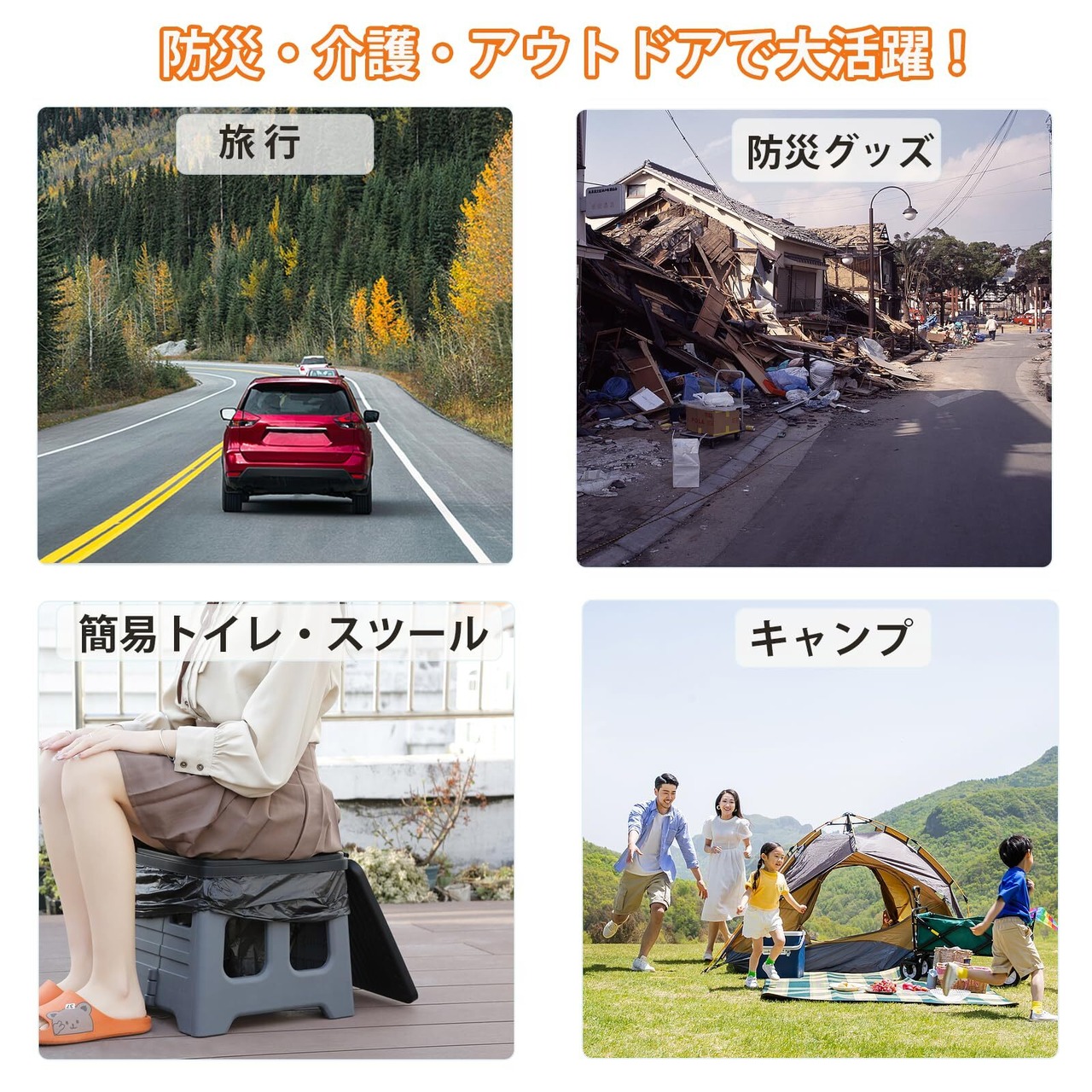 【様々な場面で大活躍】折りたたみ式の非常用トイレ、災害や車中泊、登山、アウトドア、キャンプ等様々な場面で大活躍!トイレ以外にも、踏み台、椅子、ゴミ箱等多用途でお使いいただけます。