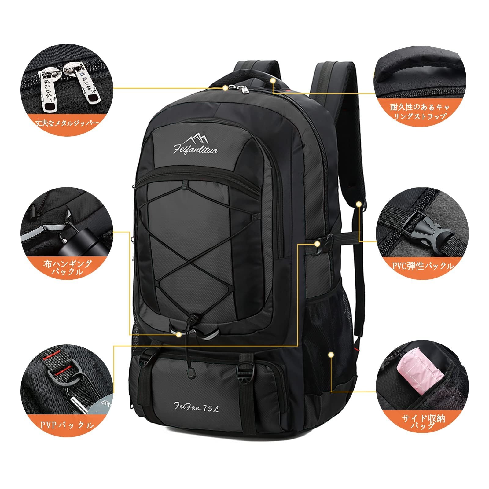 【大容量リュックサック】75Lの超大容量キャンプリュック、1つのメインジッパー式コンパートメント、3つのジッパー式フロントポケット、2つのサイドストラップ、複数のハンギングバックル。 ノートパソコン、カメラ、ハイキング用クラッチ、テント、本、衣類、靴、水ガラス、傘、その他の日用品を収納できます。