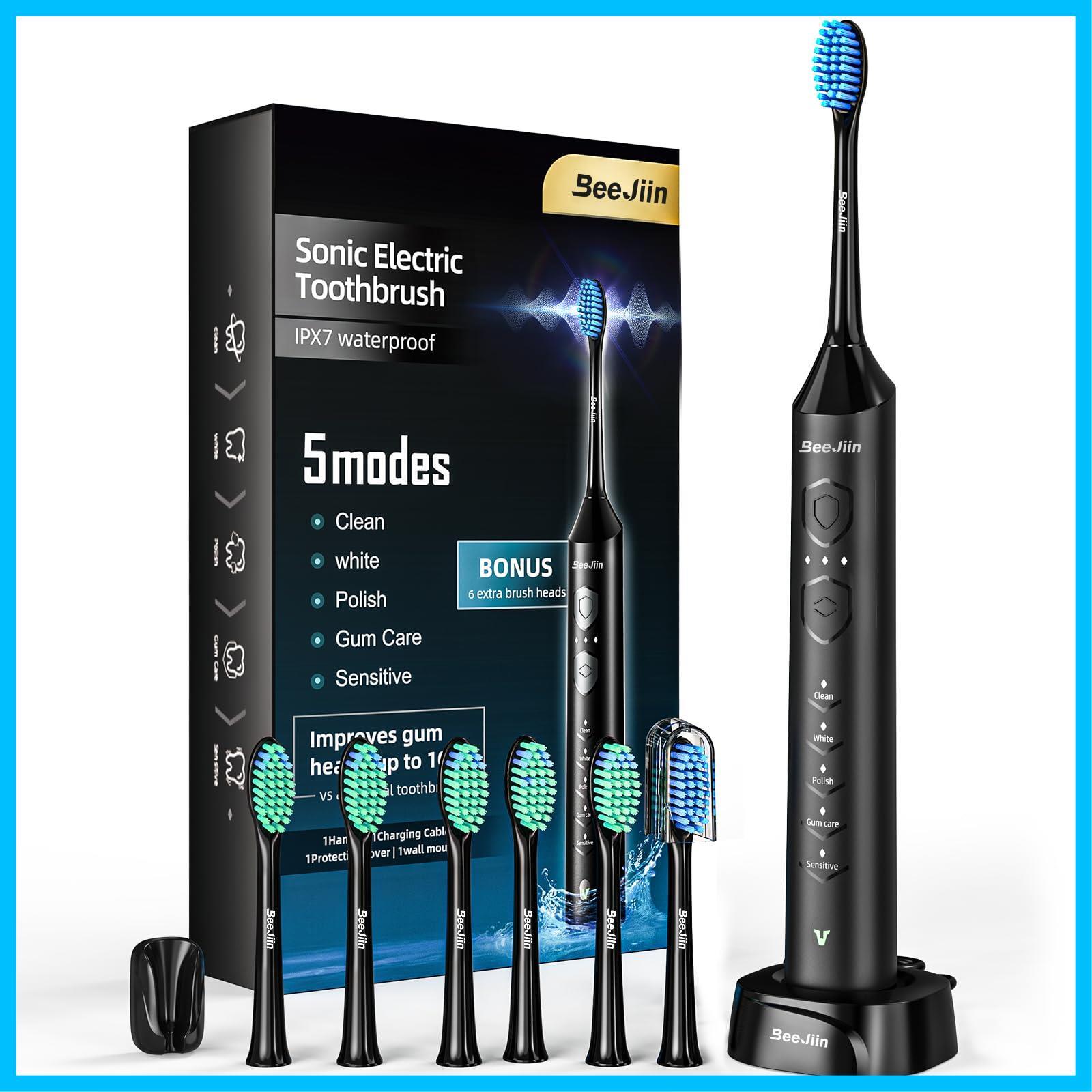 電動歯ブラシ 歯ブラシ Beejiin 音波歯ブラシ ソニック USB充電式 IPX7防水 6本替えブラシ 5つのモード 毎モード3つ強度調節可能 ハブラシ 電動歯ぶらし 電動歯磨き 収納ケース付き 携帯便利 黒