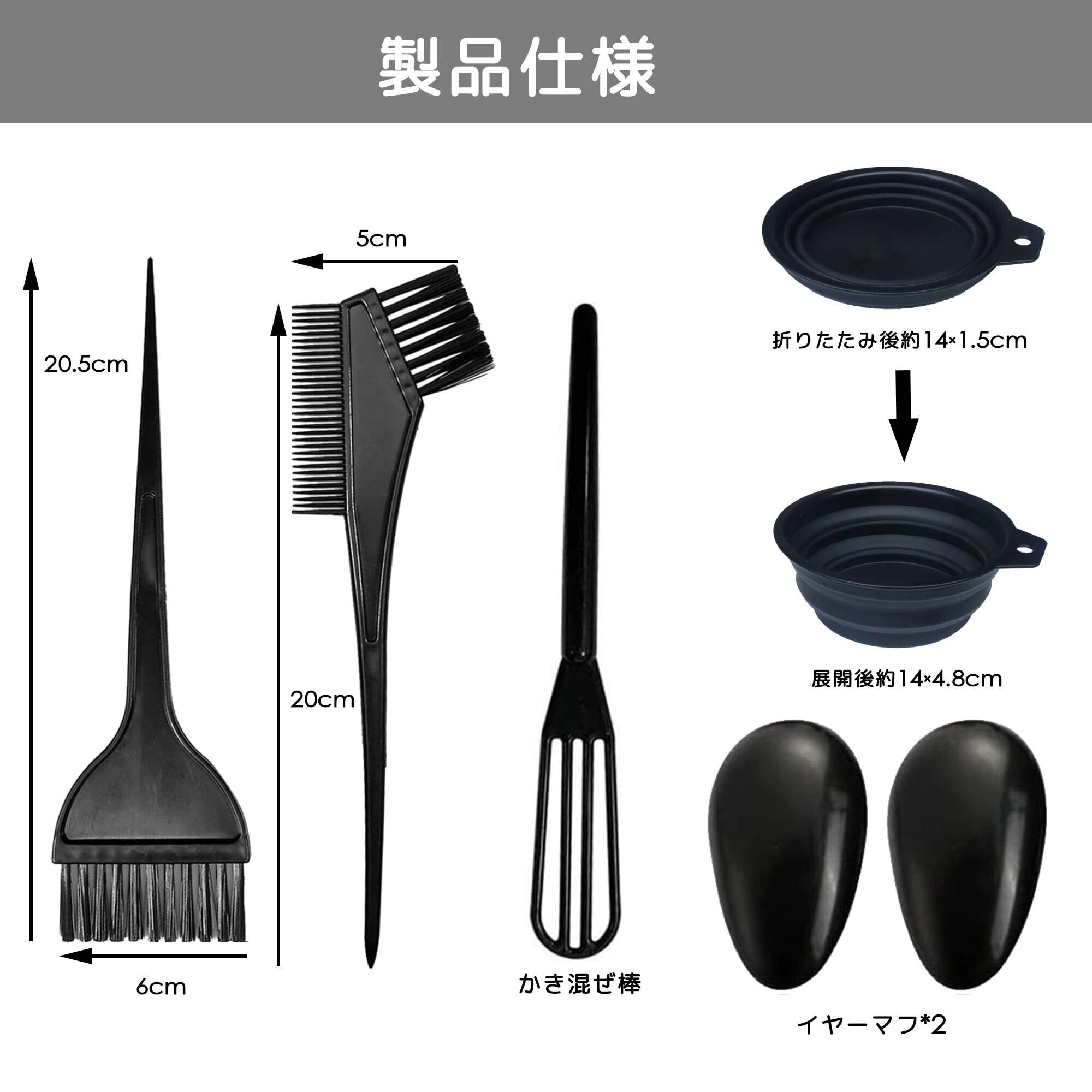 【製品仕様】染毛ツール5点セット:髪染め コーム*1、大型染毛ブラシ*1、折りたたみボウル*1、ミキシングスティック*1、イヤーカバー*2、製品重量:84g。