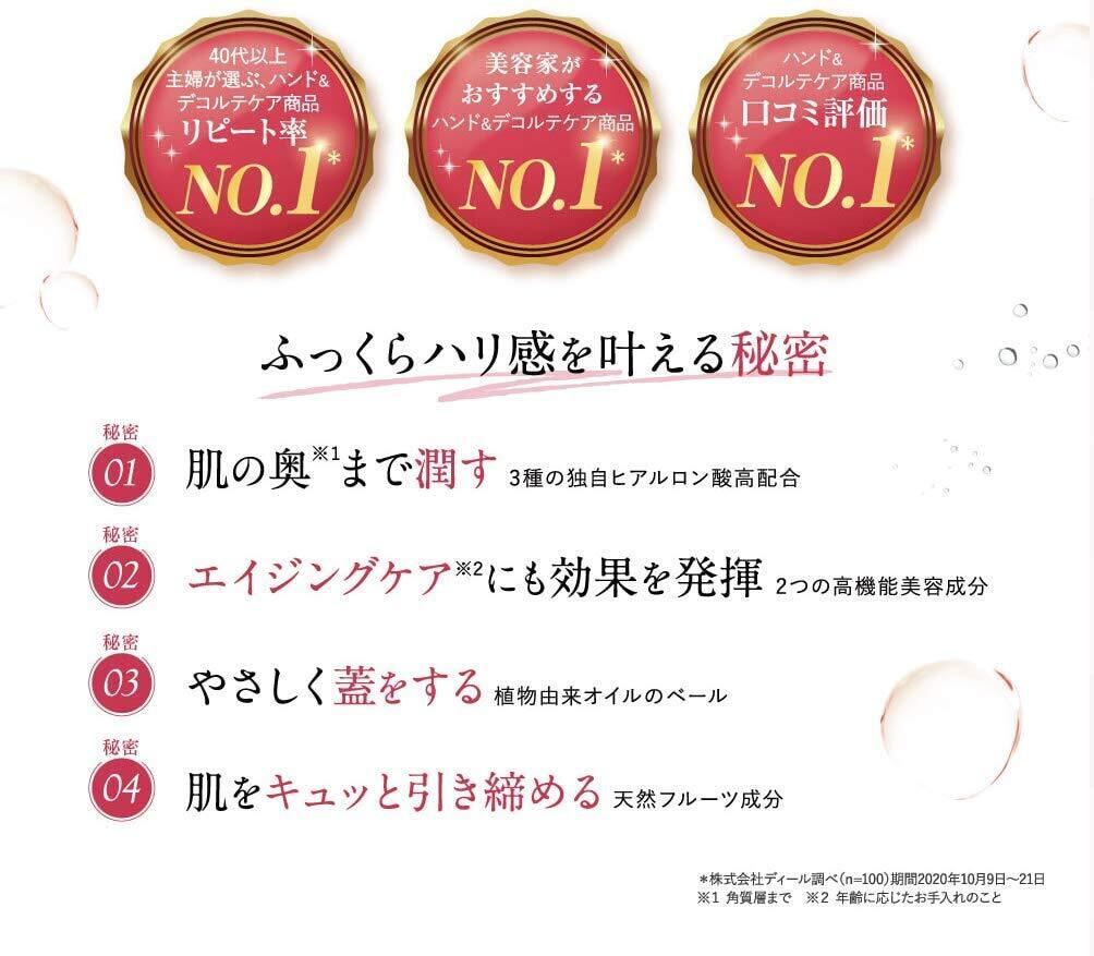 [嬉しいお声がたくさん] 「おしゃれを楽しめます!」「褒められるのが嬉しい!」「忙しい私にピッタリ!」「大満足のしっとり感」など、多くの嬉しいお声をいただきました。 手・首まわり用のエイジングケアクリーム「ハンデコルテ」でふっくら、ハリ感に自信を!