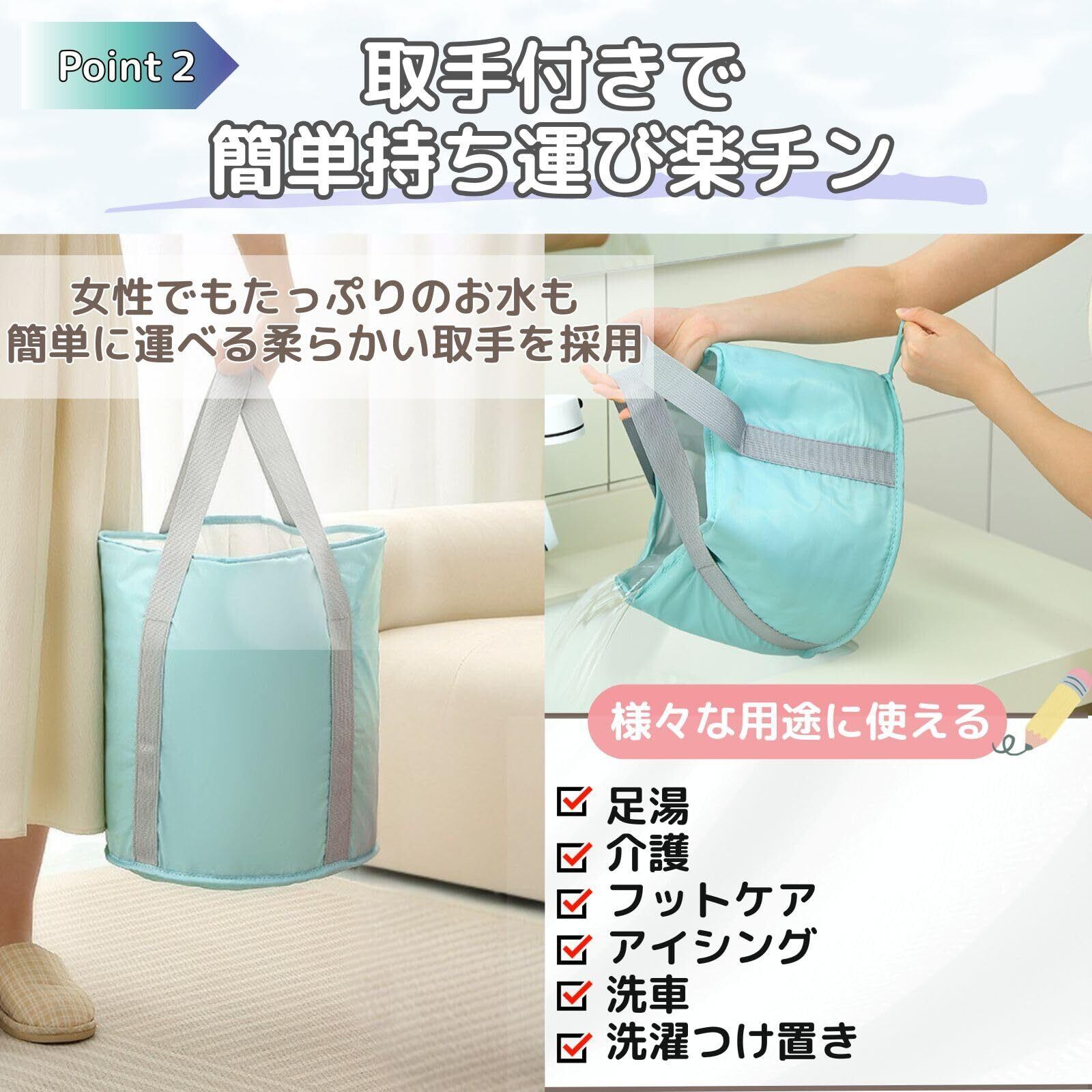【取手付きで簡単持ち運びラクラクの万能折りたたみバケツ】女性でもたっぷりの水で簡単に運べる柔らかい取手を採用。足湯やアイシングはもちろん、洗車やガーデニング、非常時の洗面器としても活躍。底部ストラップで簡単乾燥&折りたたみ収納OK。軽量で省スペース設計、使い捨て使いやすさ抜群!アウトドアや旅行にも最適。追求した優れたデザイン!