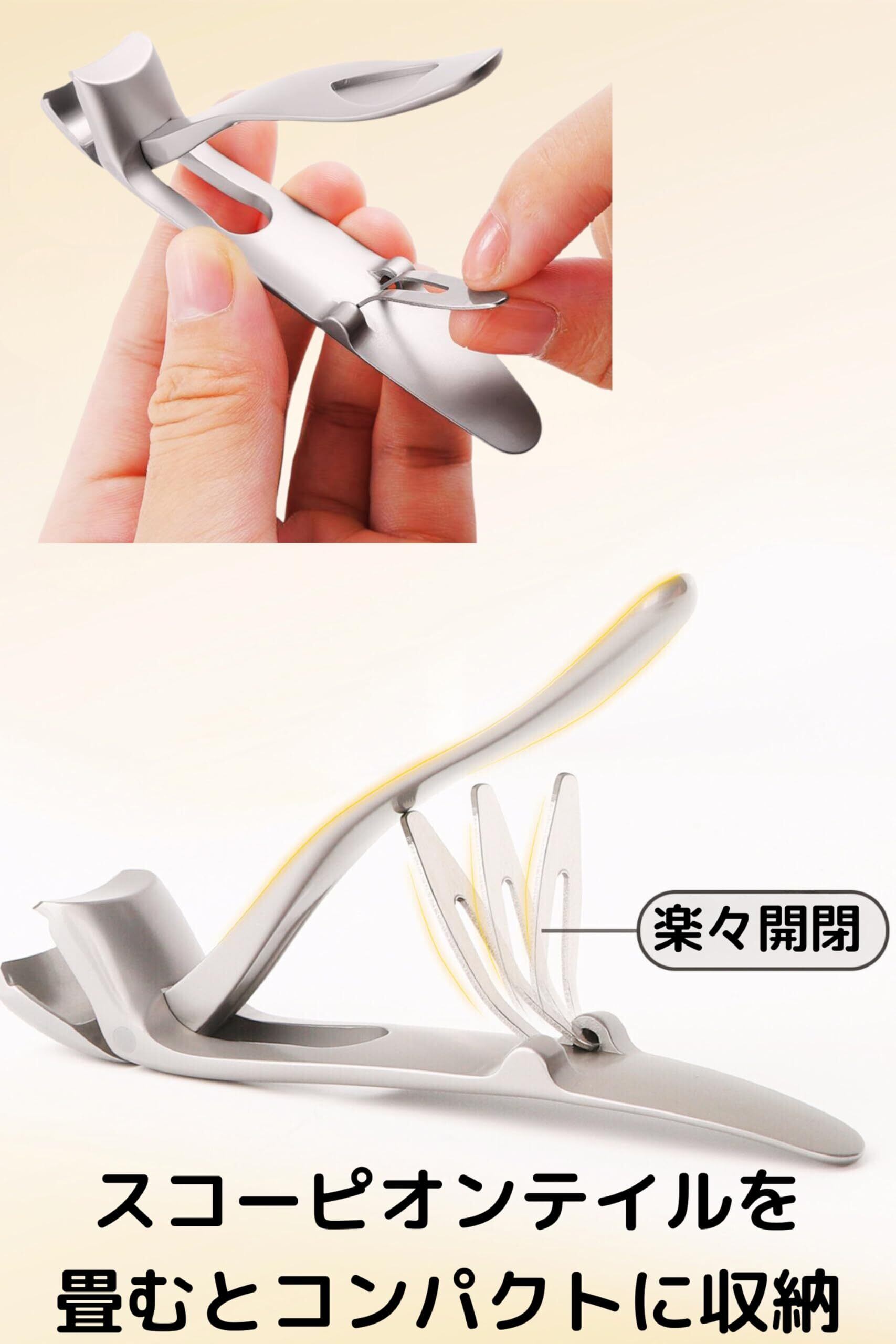 足の爪切りとしても手の指用としても手首や腰、おなかが楽にお使い頂けます。ハンドルの間のバネを畳むとスコーピオンテイルが閉じてスマートにコンパクトに収納できます