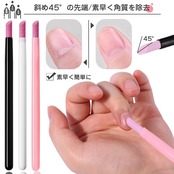 斜め45°の先端/素早く角質を除去。爪の角質を除去するクオーツペン。カットできない角質も除去します。 独創的な面取り。45°に傾斜したヘッドが爪のエッジにフィット、ペン先が爪の内側の汚れを簡単に落とします。爪の内側の汚れも簡単に落とせます。