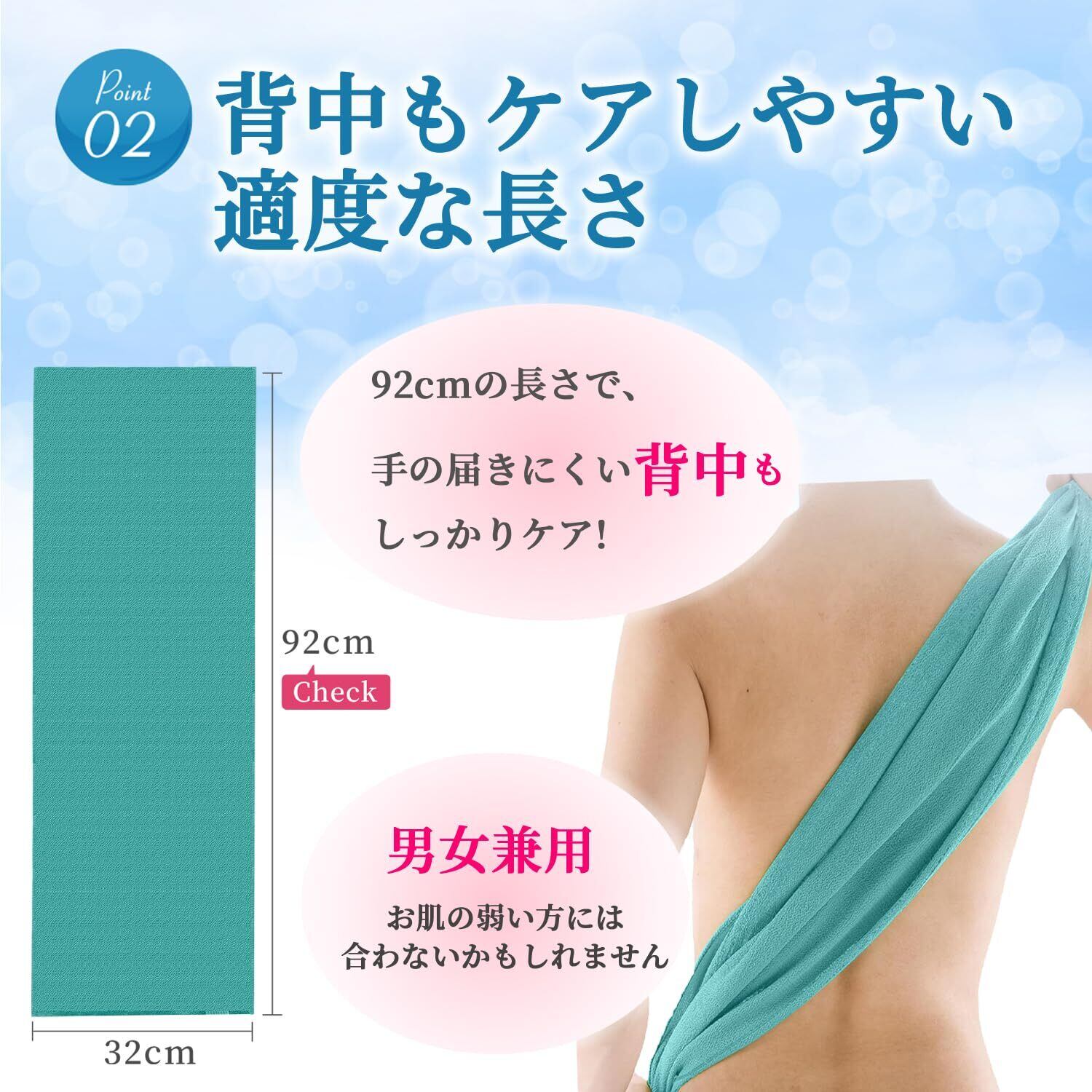背中も洗いやすい長さ (92 x 32 [cm])。背中だけでなく、気になる部分全身で使用可能。