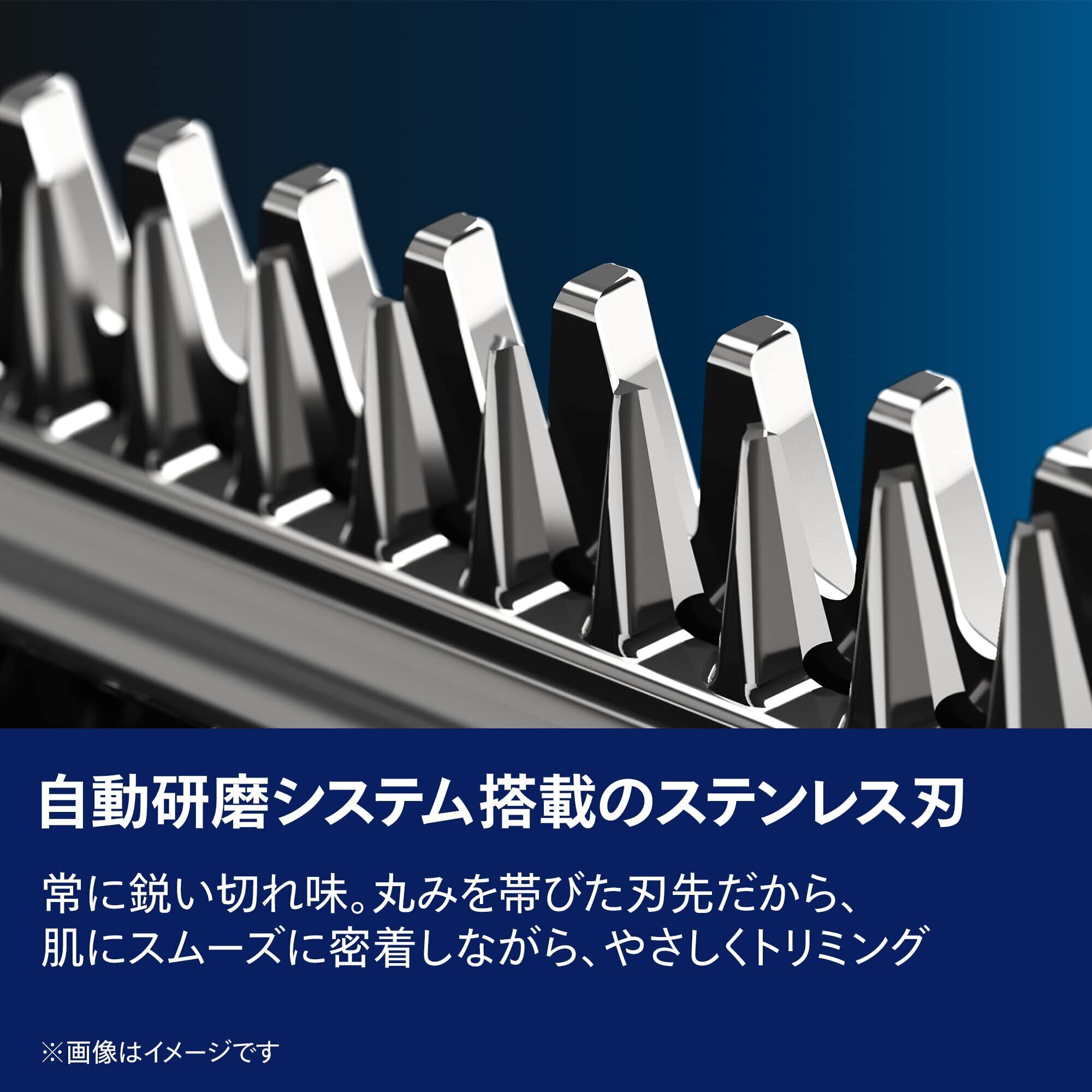 ヘアーストリームテクノロジー搭載 カットした髪がコーム内に詰まりにくいフロント接続コーム設計。スムーズな刈り心地で簡単にセルフカット。