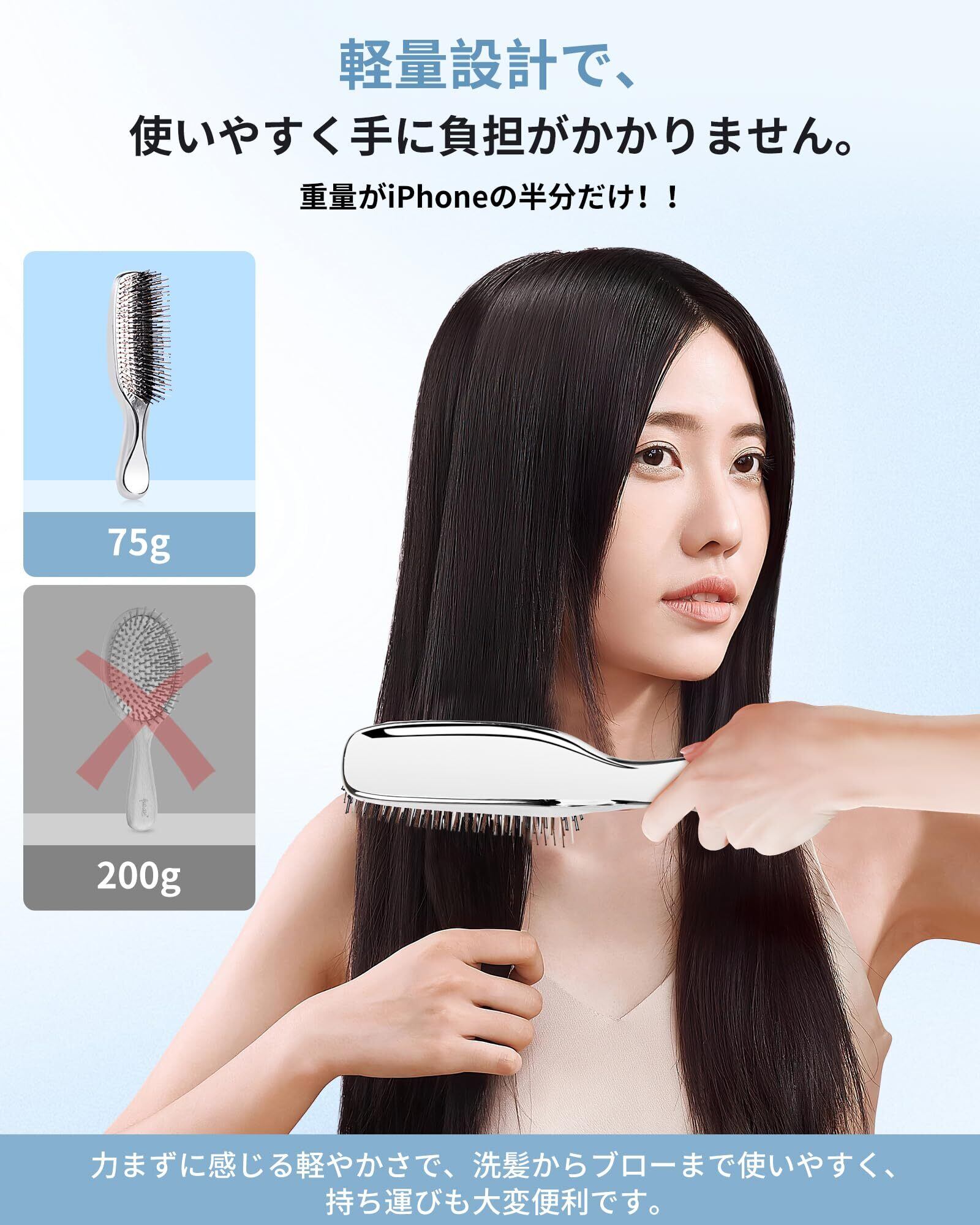 【防静電効果が優秀】このブラシ防静電剤を配合した特殊な梳針を採用しており、髪の正電荷を効果的に中和し、うっとうしい静電気を抑制します。この梳を使用することで、髪はより光沢があり、ボリューム感と濃密感がアップし、分け目を自然に隠すことができ、簡単に雰囲気のあるヘアスタイルを完成させることができます。