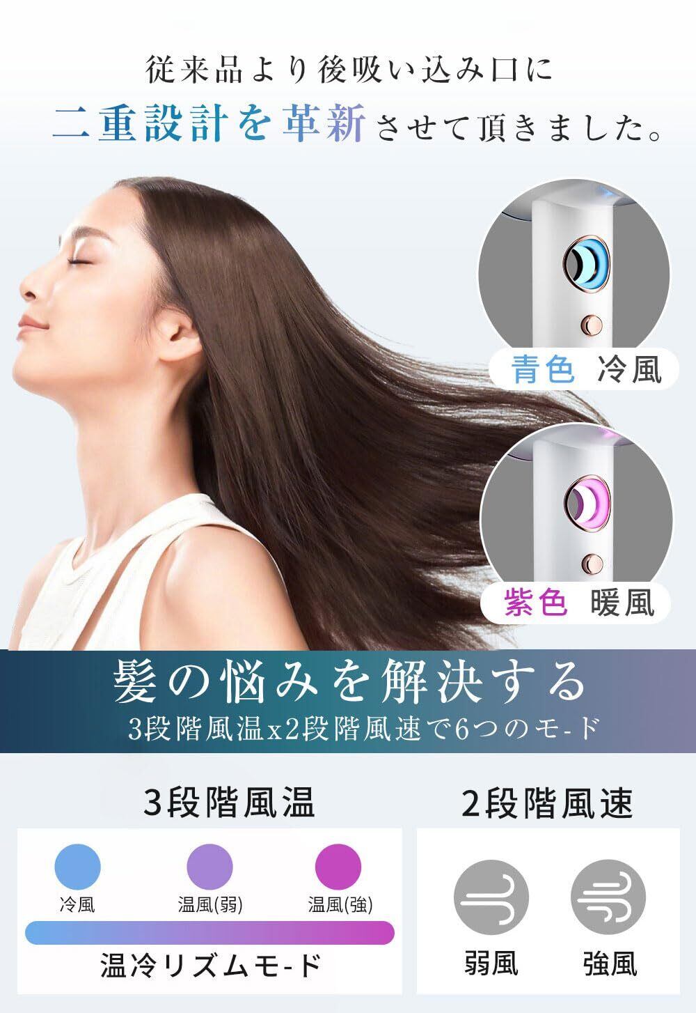 【大風量で素晴らしい速乾性】 超高速モーターが搭載されて、最強風速は23 m/sに達することができます。髪を洗った後素早くドライヤーで乾かせます。3段階の熱風と冷風のモードが搭載されて、手元のボタンを押すだけですぐにモードを切替ます。熱風を長時間当てることによるダメージを軽減してくれます。更に360°集風ノズルの設計に加え、効果的に風力を集中させながら時短で髪のスタイリングを手軽に仕上げられます。