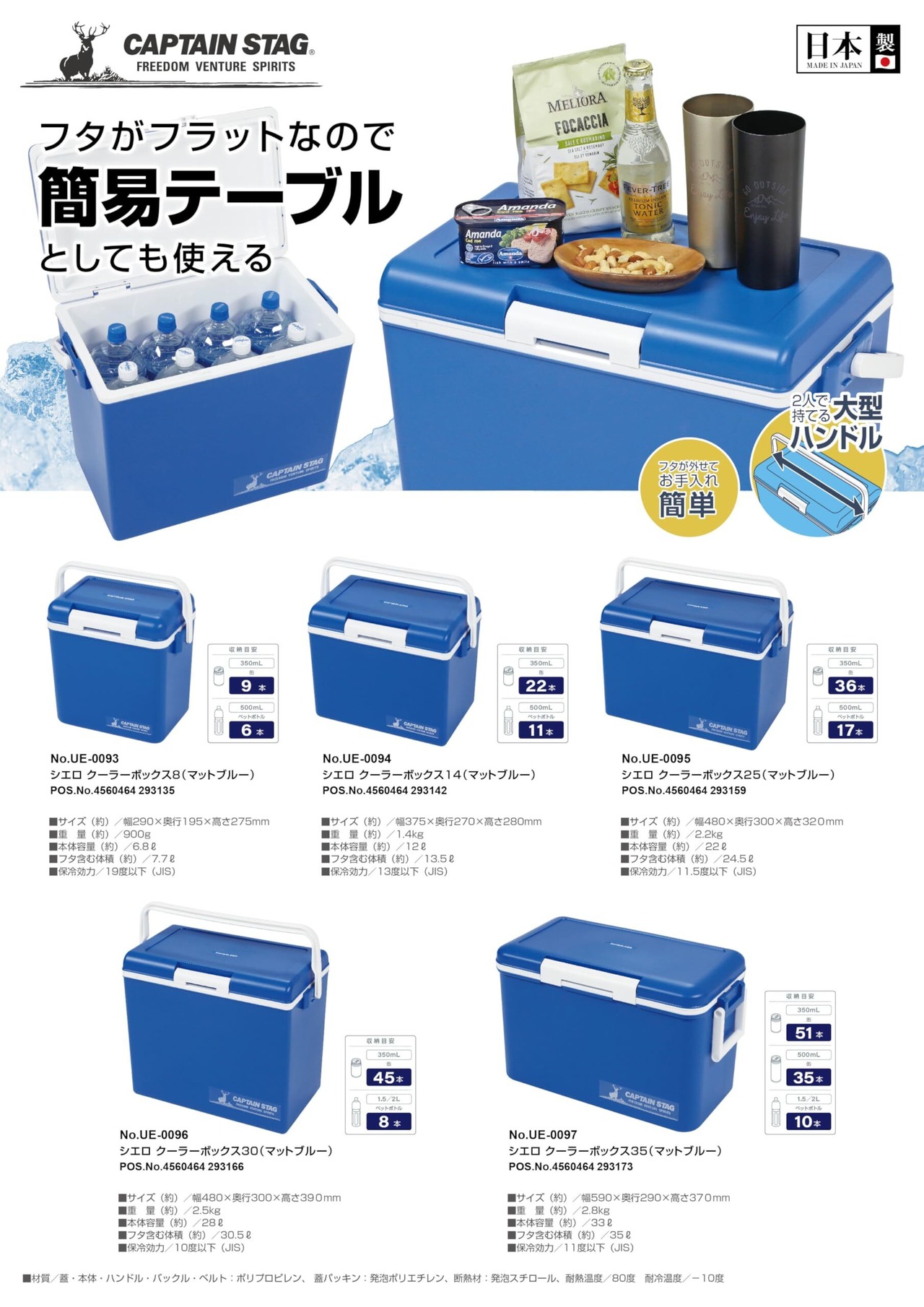 材質:蓋・本体・ハンドル・バックル・ベルト/ポリプロピレン、蓋パッキン/発泡ポリエチレン、断熱材/発泡スチロール(耐熱温度=80度、耐冷温度=-10度)、原産国:日本