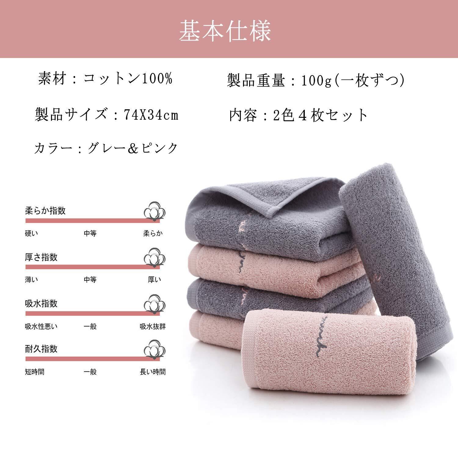 Etech フェイスタオル 74x34cm 綿100% 4枚セット(2色でGray&Pink) 瞬間吸水 速乾 抗菌防臭 家庭/ホテル/スポーツなどに最適 柔らかな肌ざわり 贈答品 (2色) | グランメゾンショップ