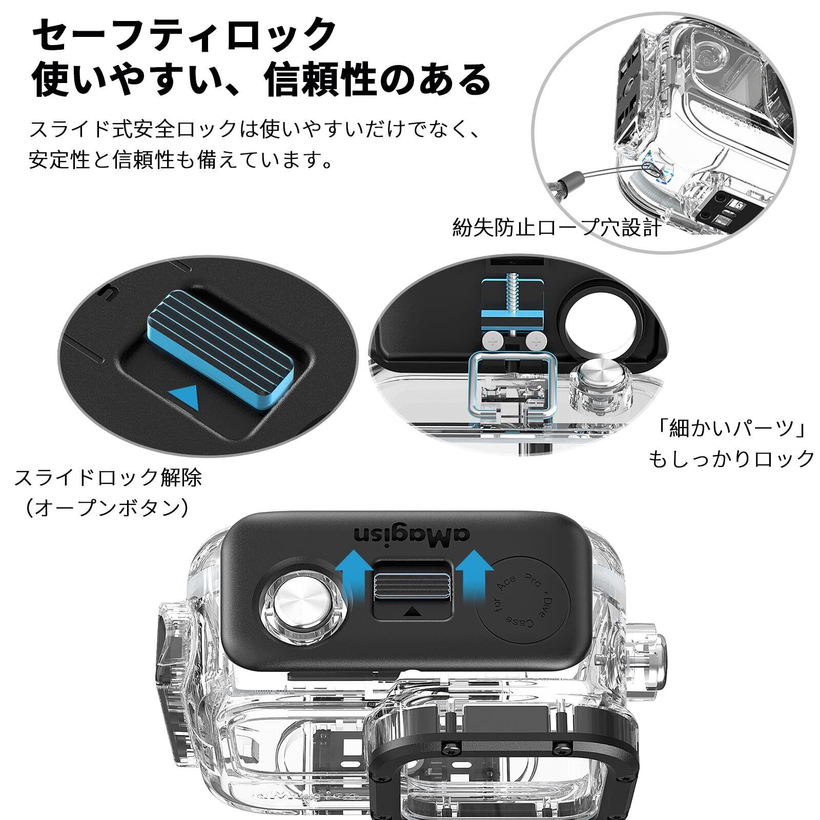 【安全ロック】スライド式安全ロックはシンプルで使いやすいだけでなく、安定性と信頼性も備えています。 防水ケースには紛失防止ロープ用の穴があり、必要に応じて紛失防止ロープを取り付けることができ、より安全にカメラを使用できます。