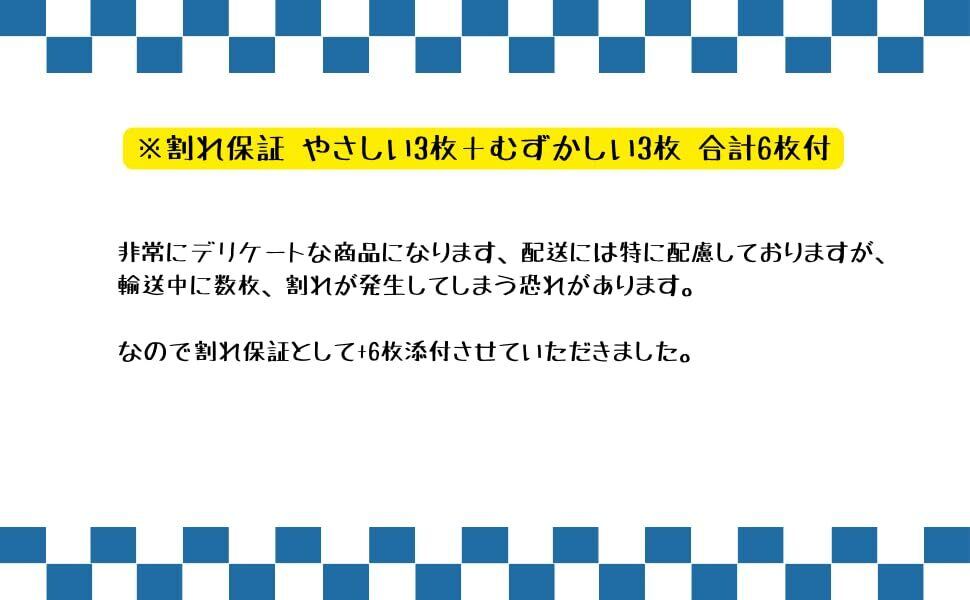 商品の性質上、配送には特に配慮しておりますが数枚割れてしまう可能性がございます。