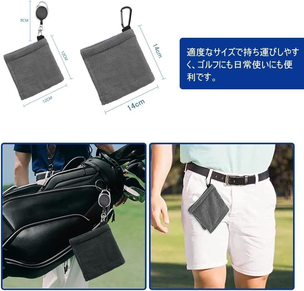 ゴルフボールクリーナー ゴルフボールクリーニングタオル ゴルフタオル拭き ゴルフクラブタオル ゴルフ用清潔具 カラビナ付き キーホルダーバックル ボール拭き 清潔用 マイクロファイバー タオル 防水 便利 ゴルフクリーニング用 14*14cm 2個入り (グレイ+ブラック)