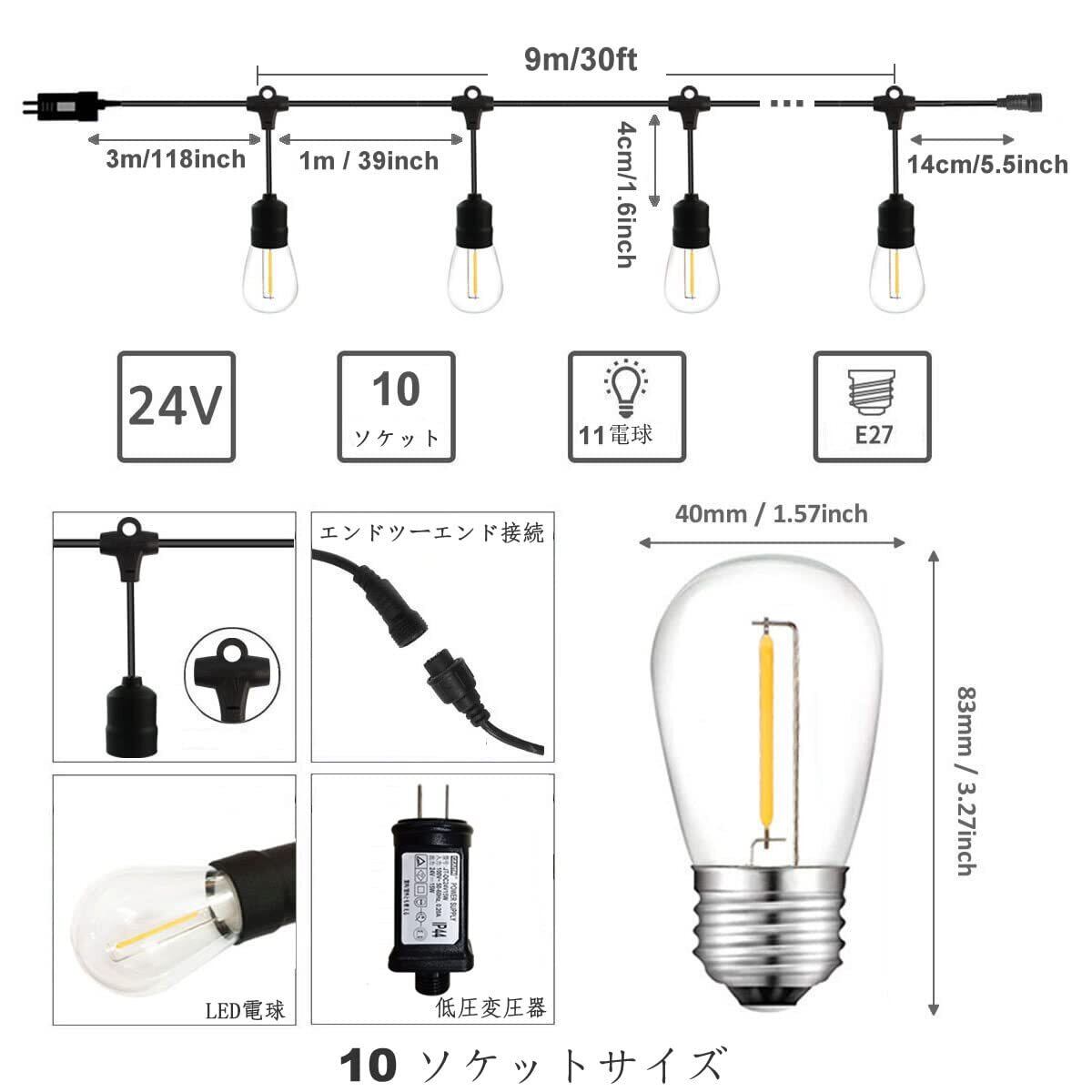 【製品の仕様】コード長さ:約9m,ソケット間隔:約1m,電源コードの長さ:約3m, ソケットサイズ:E26,電球10個+1個スペア電球,色温度:2700k 暖かい光
