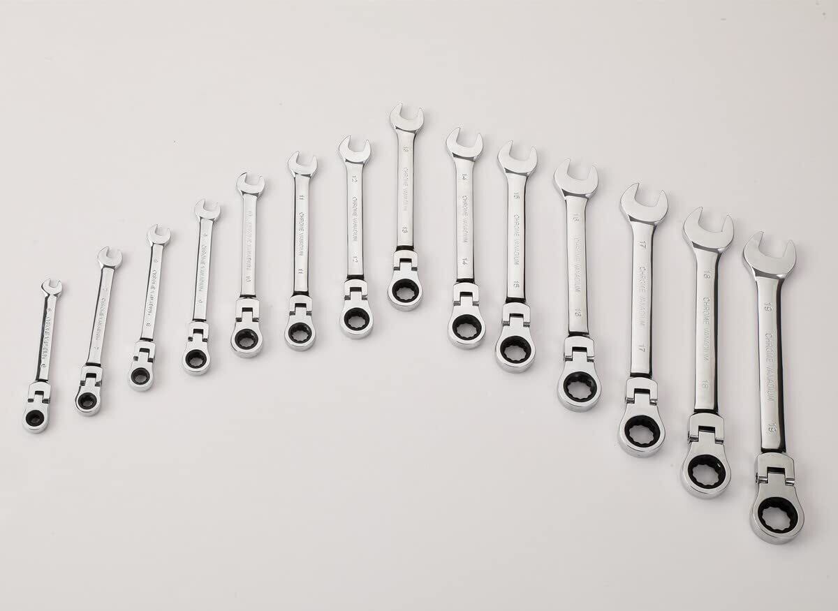 【セット内容】6mm、7mm、8mm、9mm、10mm、11mm、12mm、13mm、14mm、15mm、16mm、17mm、18mm、19mmフレックスラチェットレンチ各1点 、収納ケース1点