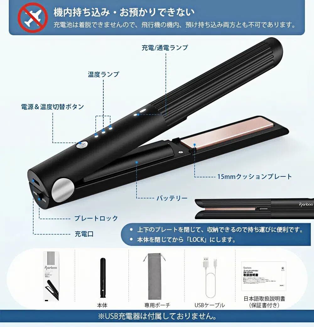 Ryanboo コードレスヘアアイロン USB充電式ヘアアイロン コードレス ミニヘアアイロン メンズ 持ち運び用ヘアアイロン 前髪 3段階温度調整 MAX200℃ 15mm (Black) | グランメゾンショップ