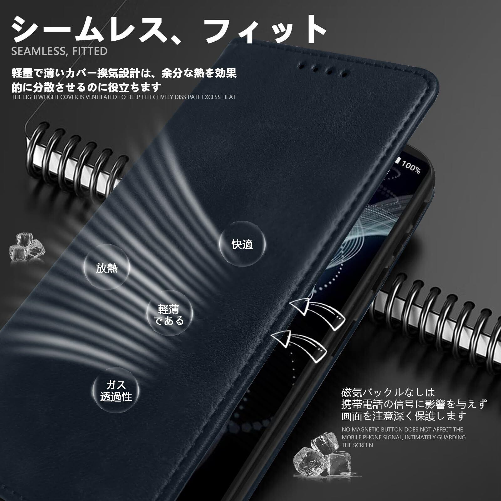 【全面保護】手帳型ならではの全面保護機能でディスプレイはもちろん、背面もしっかりガードします。さらにカメラレンズ保護構造でスマホ本体を傷から360度しっかり保護してくれます。丈夫でほど良い厚みで、落としてもスマホをきちんとお守れます、デザインはシンプルであるこそ、携帯の高級感を引き立たせる