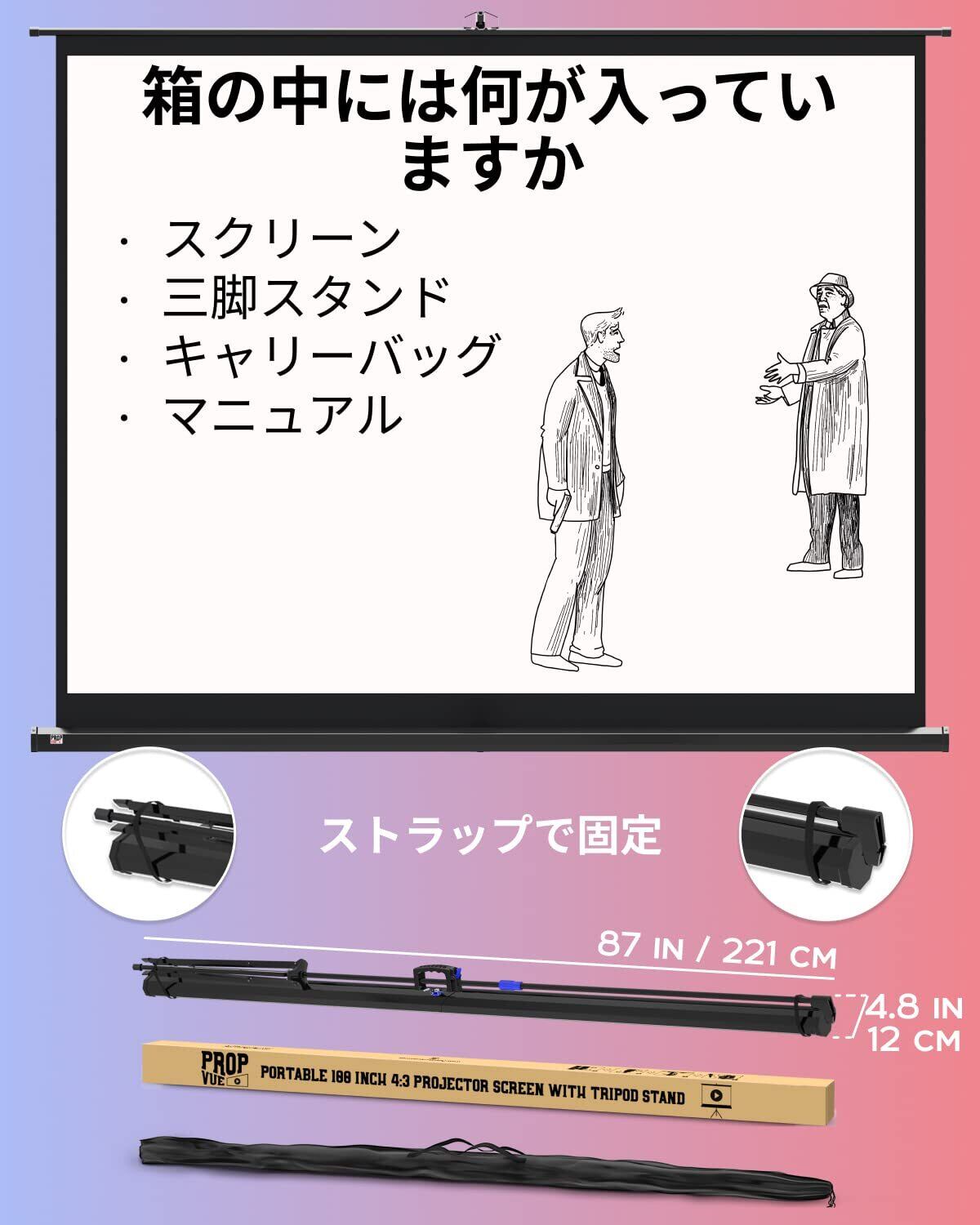 PropVue プロジェクター スクリーン スタンド付き 100インチ(250㎝) - 16:9から4:3まで調整可能室内 屋外 プロジェクション スクリーン 映画 オフィス プレゼンテーション - HD 最高級 リンクルフリー プロジェクター用三脚 キャリーバッグ タイトストラップ付き | グランメゾンショップ