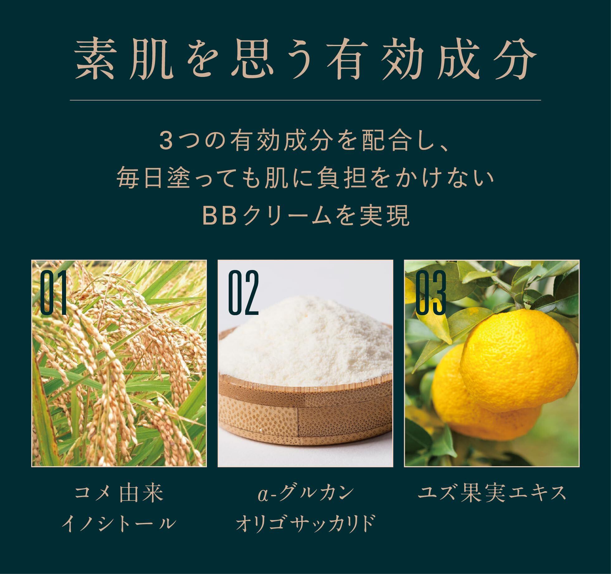 【毎日使える素肌に優しい乳液のような使用感】 初心者の方でもムラなく塗れるよう、さらっとした乳液のようなテクスチャーに仕上げました。 また肌に優しい3つの有効成分を配合。①肌表面の水分油分バランスを整える米由来成分のイノシトール※1を配合。 ②肌の常在菌バランスに着目し、α-グルカンオリゴサッカリド※1を配合。 ③肌荒れを防ぐユズ果実エキス※1を配合。 ※1 配合目的「整肌成分」