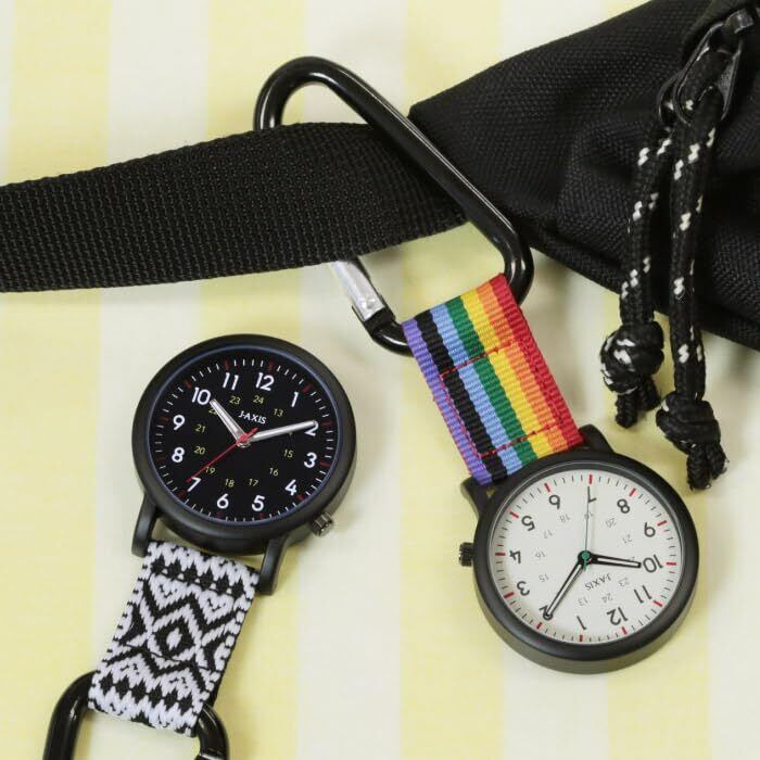 カラビナがフック代わりになっている懐中時計。文字盤の色は他にホワイトが有ります。