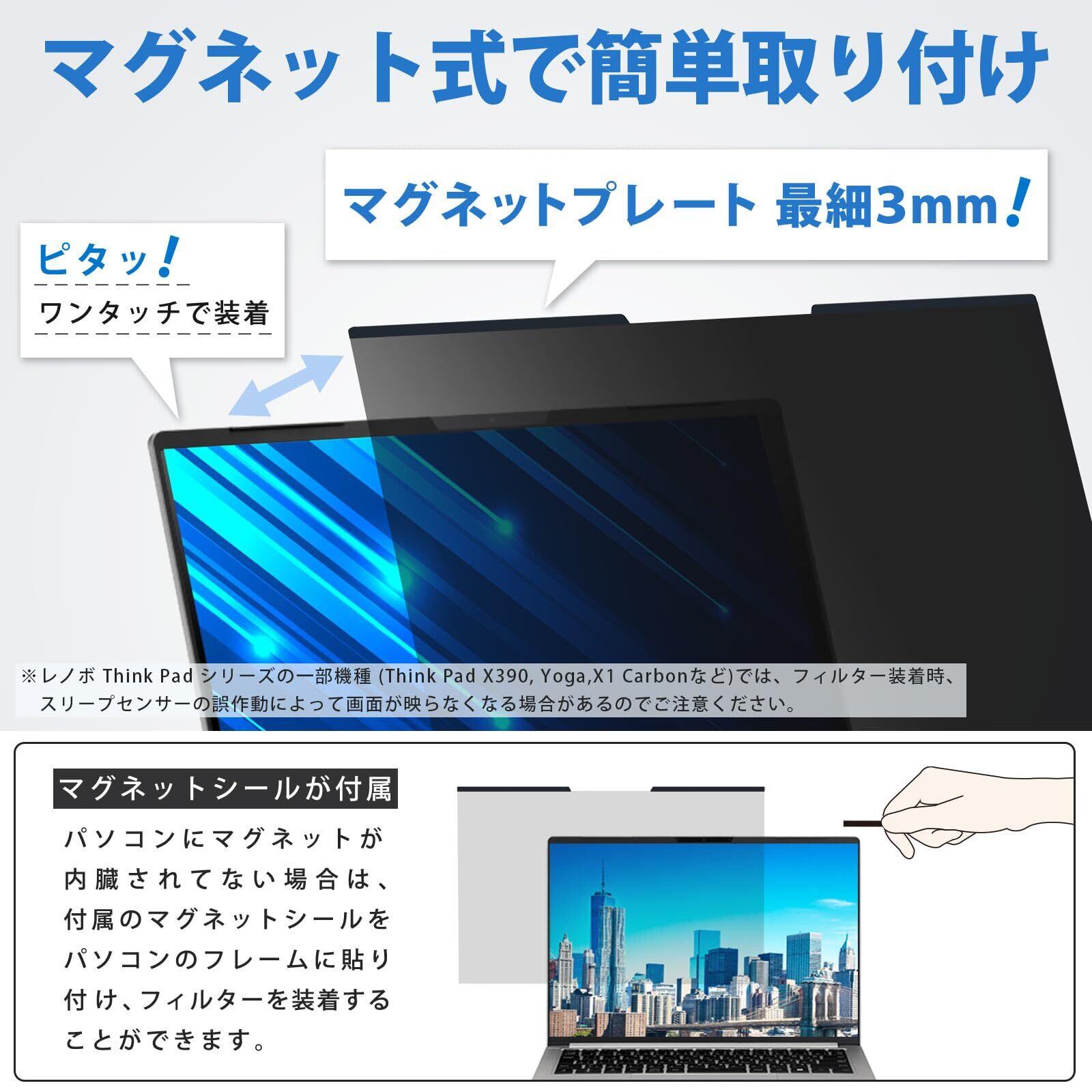 ビジネスシーンにぴったり:出張の移動中など、新幹線や飛行機内でのプライバシーを確保することができるので、どこでも安心して業務を行えます。※非対応機種:レノボ Think Pad シリーズの一部機種 (Think Pad X390, Yoga,X1 Carbonなど)では、フィルター装着時、スリープセンサーの誤作動によって画面が映らなくなる場合があるのでご注意ください。その場合は、マグネットの位置をセンサーからずらして調整することによって改善される可能性があります。