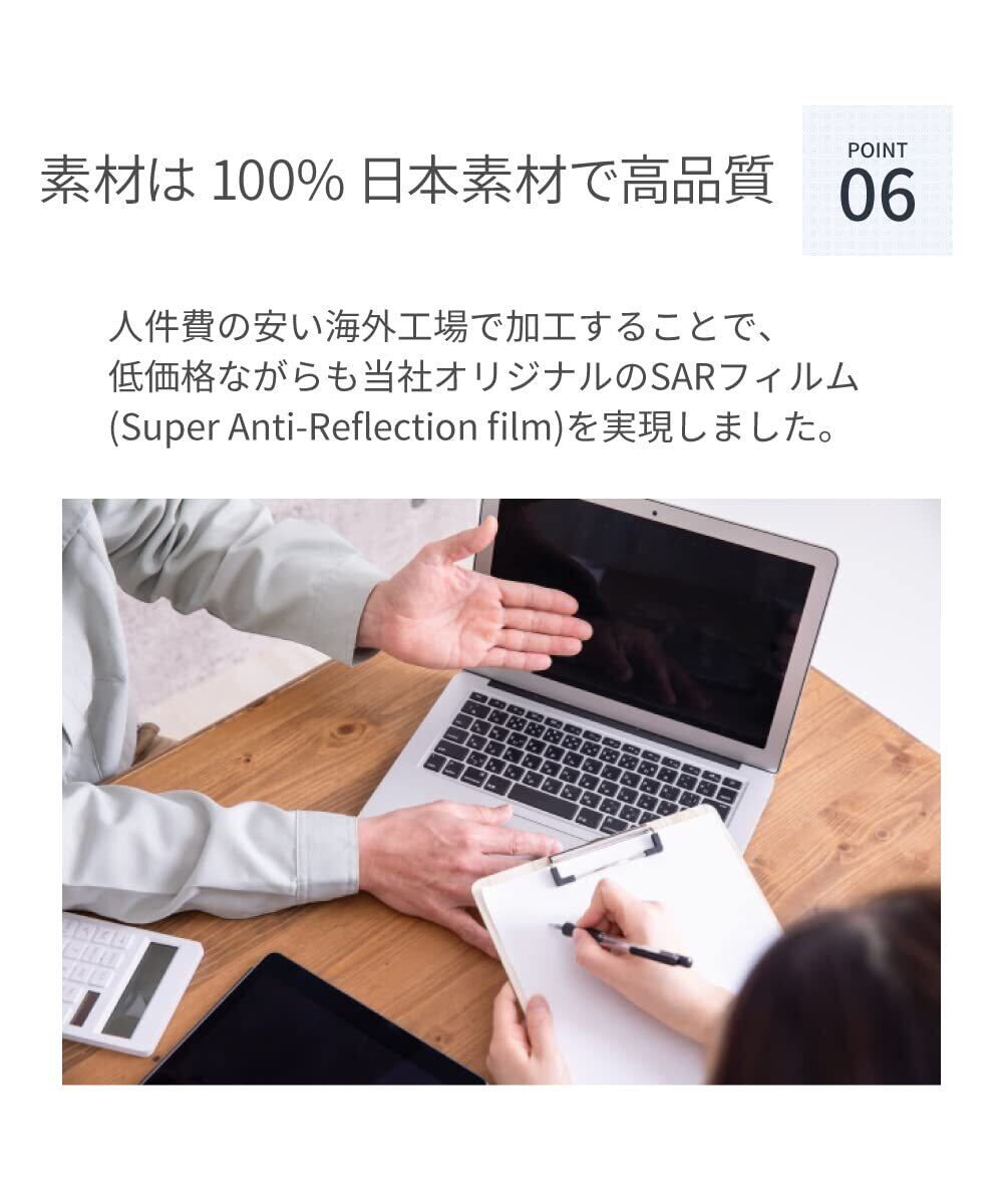 【低反射】 反射率1.1%と通常の光沢フィルムやガラスフィルムよりも遥かに反射が抑えられます。窓際や蛍光灯の多い場所での作業を快適にします。※ご参考までに※ 最新Macbookの反射率は1.8%ほどです。光沢フィルムやガラスフィルムでは反射率が大きくなってしまいますが、本フィルムであればフィルムを貼っていないときと同じ反射防止効果が得られます。