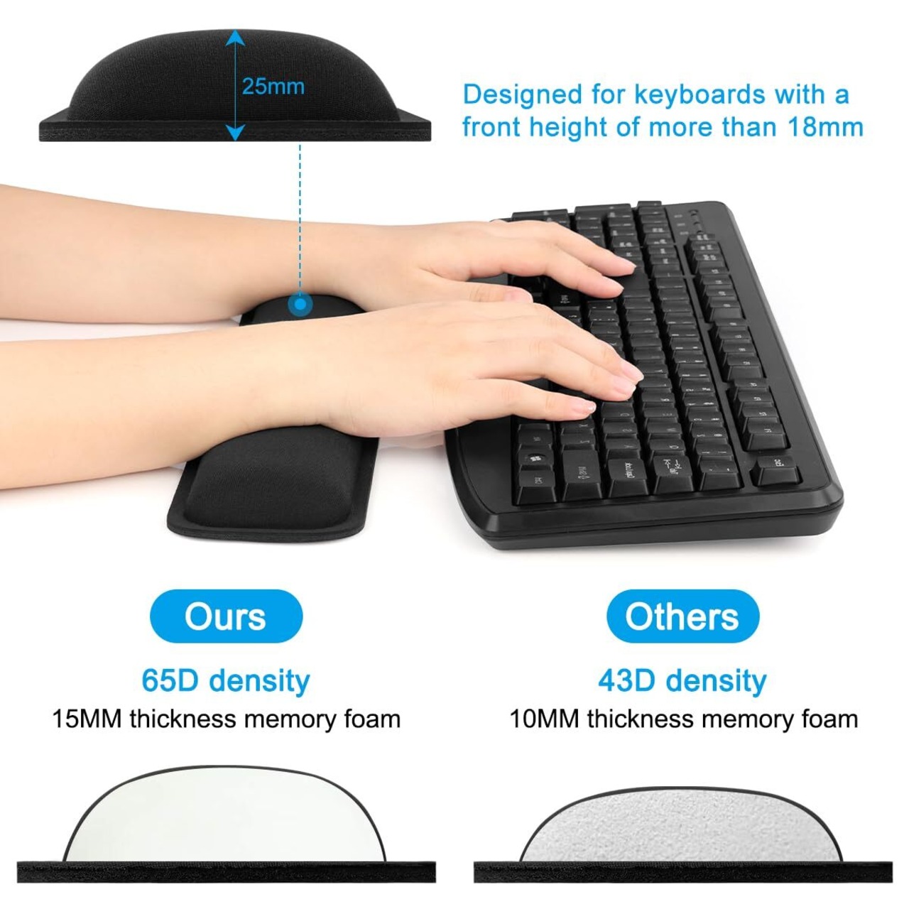 【手首を守る】:人間工学に基づき、キーボード入力時、手首や手にサポートします。コンピュータを長時間で使用する方には手首を守るキーボード用低反発リストレストです。