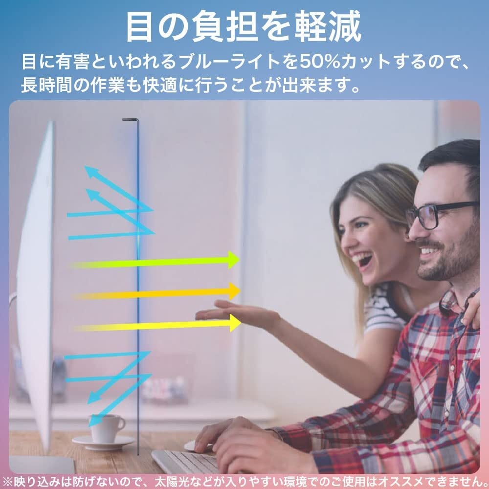 【ブルーライトカット】LED液晶ディスプレイが発する光の中の青い部分「ブルーライト」も約50%カットします。※ブルーライトは目の角膜や水晶体で吸収されずに網膜まで到達し、網膜の機能低下を引き起こす場合があると言われています。 ※映り込みは防げないので、太陽光などが入りやすい環境でのご使用はオススメできません。