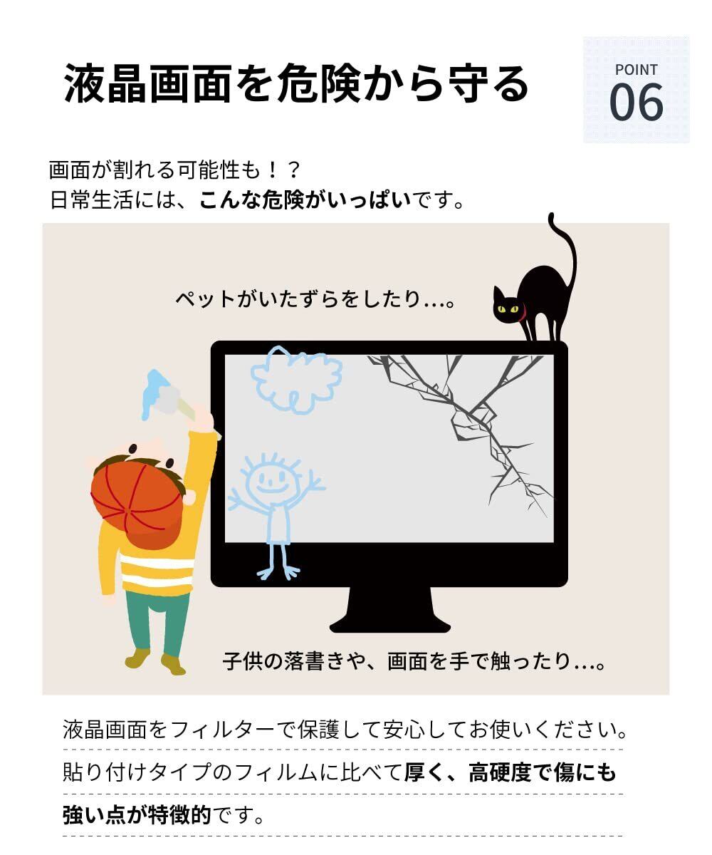 【高硬度】 子供の手垢でいっぱいになったり、落書きをされたり、おもちゃをぶつけられたり、ペットがイタズラをしそうになった経験はありませんか? 本フィルターは厚さ2mmで表面硬度9Hと強靭。 スクラッチ(傷)や、衝撃にも強く、モニターを使用しないときでもフィルターをかけているだけで安心です。