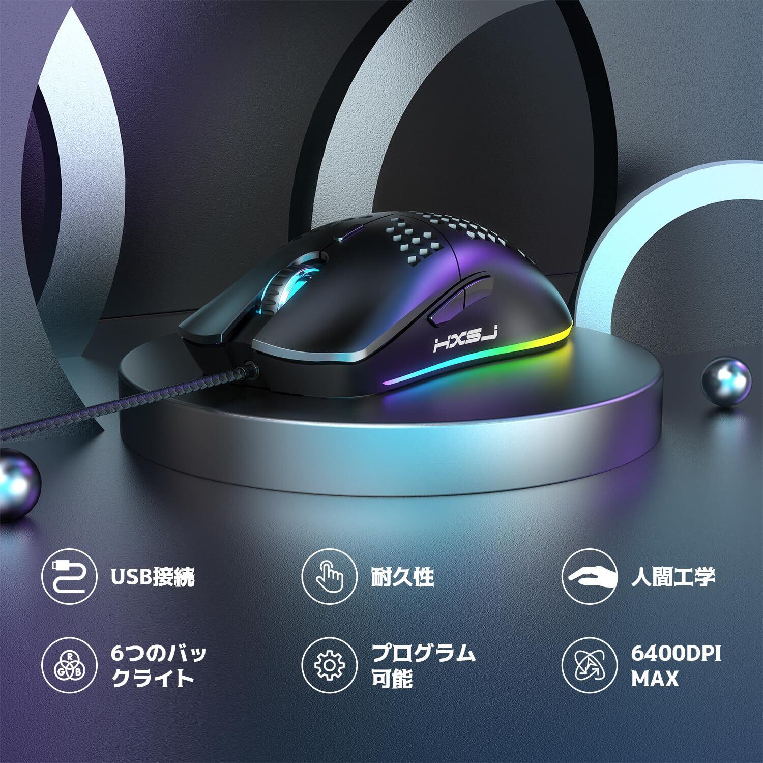 【プログラム可能なRGBゲーミングマウス・ハニカム構造デザイン】ドライバーソフトウェアをインストールすることで、6つのボタンにカスタマイズ可能な機能を割り当てることができます。これには、左ボタン、右ボタン、スクロールホイール、DPIボタン、そして2つのサイドボタンが含まれます。高精度なポジショニングゲームエンジンを搭載しており、安定した伝送を実現。800、1600、2400、3200、4800、6400の6段階のDPIを簡単に調整でき、さまざまなゲームシーンに合わせて最適な操作が可能です。また、耐久性にも優れており、5000万回のクリックに耐える光学式スイッチを採用。ハニカム構造による超軽量設計で、手首への負担を軽減し、長時間のゲームプレイにも快適です。背面のスイッチで照明効果の切り替えや、照明をオフにすることもできます。