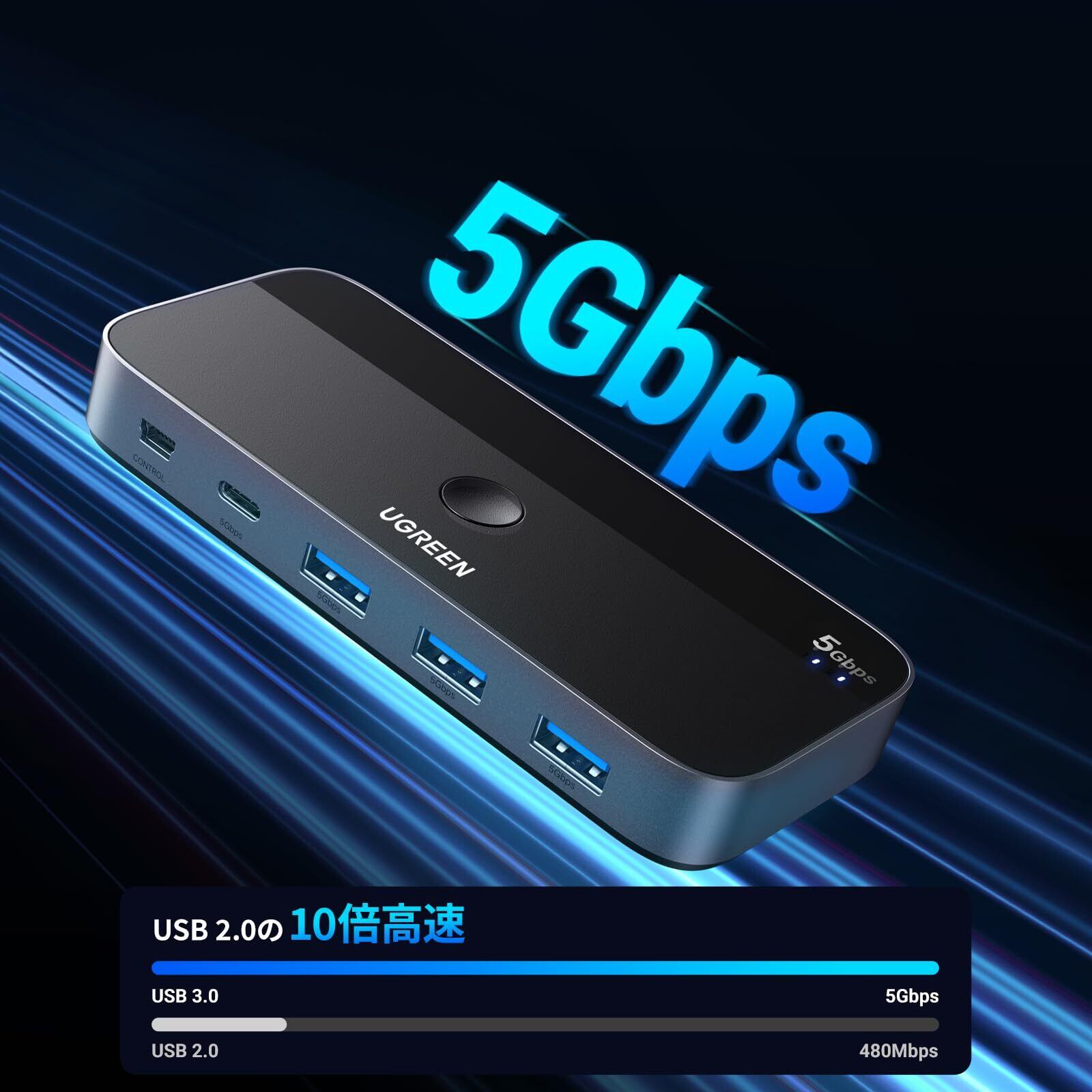 【USB-CとUSB-Aデバイスを接続】: USB 3.0切替器は、1つのUSB Cポートと3つのUSB Aポートを備え、さまざまなUSBデバイスの接続をサポートします。USB-Cポートは、USB-Cハブまたは他のUSB-Cパソコンに接続することができ、2台のコンピュータ用にポートを拡張することができます。2台のUSB-CポートのPCを接続する場合は、C-A OTG変換ケーブルまたはUSB-CtoCケーブルを使用する必要があります;