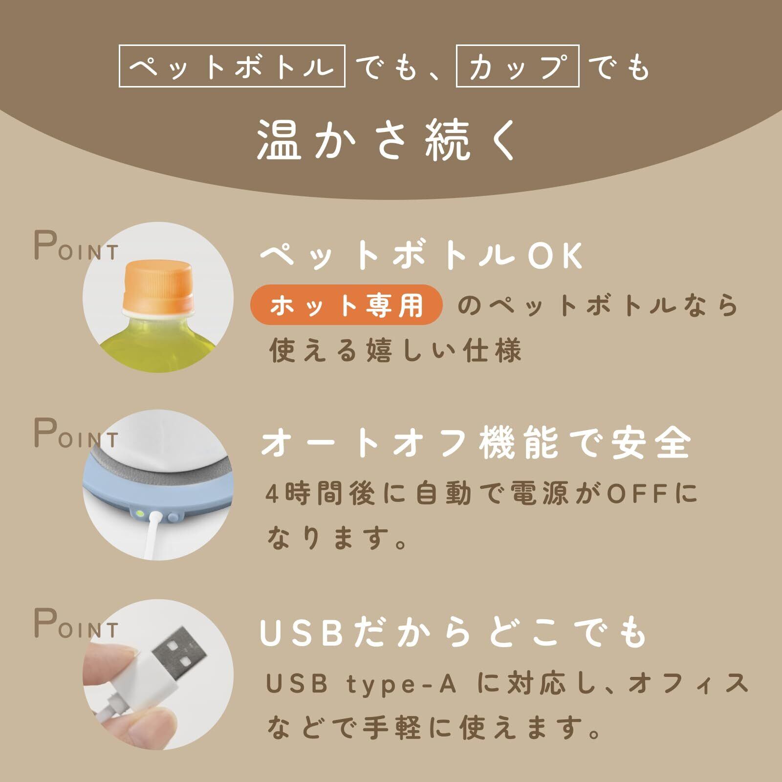 ペットボトルでも使える、薄型のカップウォーマー。飲み物を長時間保温します。ホット専用のペットボトル、耐熱素材のマグカップの使用が可能!切り忘れ防止に4時間OFFタイマーがあるので安心です。
