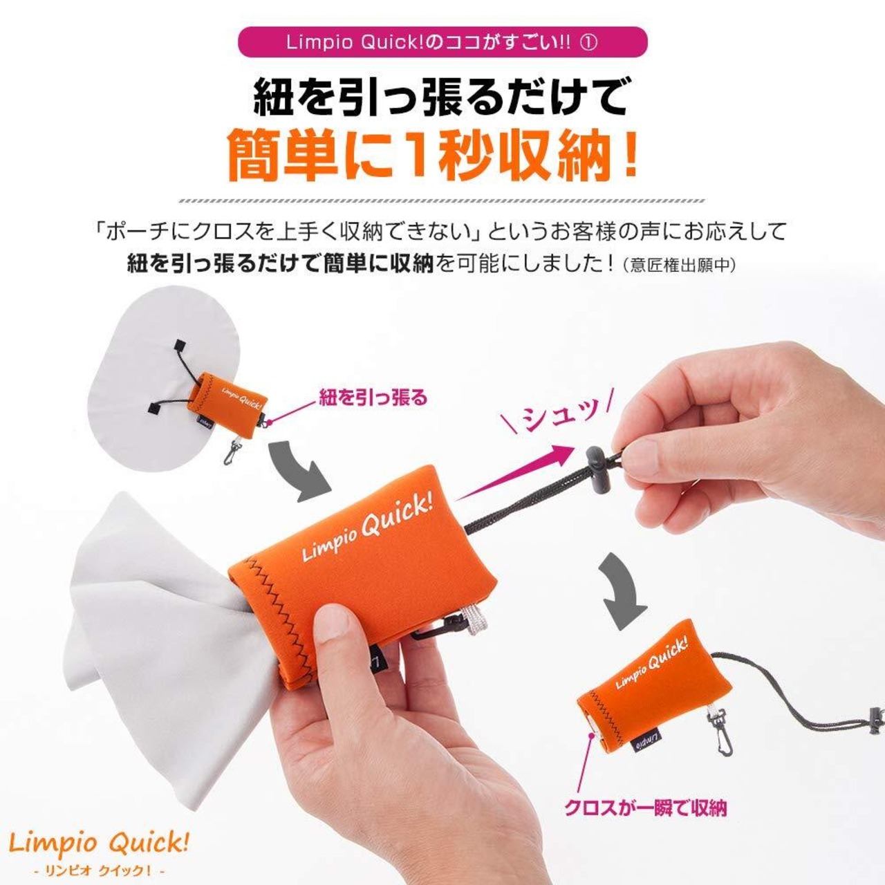 【 意匠登録 & 簡単収納 】Limpio Quick!(リンピオ クイック)は、意匠登録第1671575号を取得した、デザインと機能性が際立つ革新的な商品です。実用性を追求した結果、お客様の「ポーチにクロスが収納しにくい」というお悩みに応えるため、”紐を引くだけ”でクロスを手軽に収納できる独自の仕組みを採用。面倒な畳む作業の手間を無くし、ワンアクションで収納できるようになりました。また、軽量設計により、男女問わず快適にお使いいただけます。