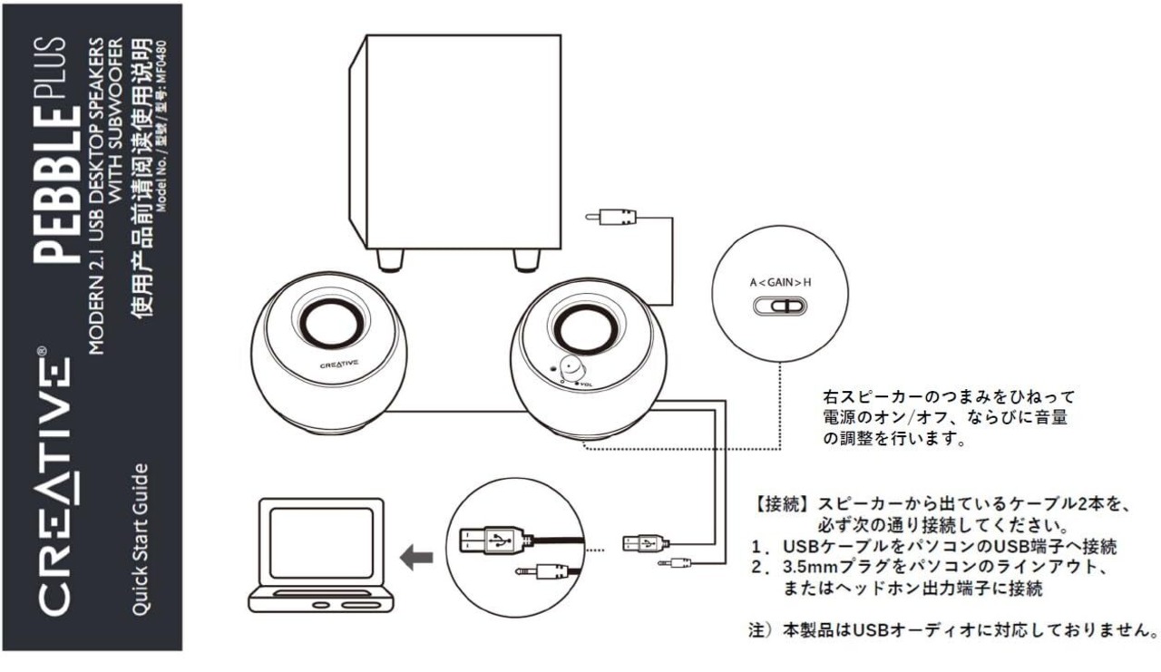 【サブウーファー付 3.5mmプラグケーブルモデル】PCのUSBポートや市販のUSB電源アダプターで給電が可能で、音声は手軽な3.5mmプラグケーブルを接続するだけの大人気、Creative Pebble譲りのデザインにコンパクトサイズでダウンファイアリングサブウーファーを追加したUSB給電コンパクト2.1chスピーカー