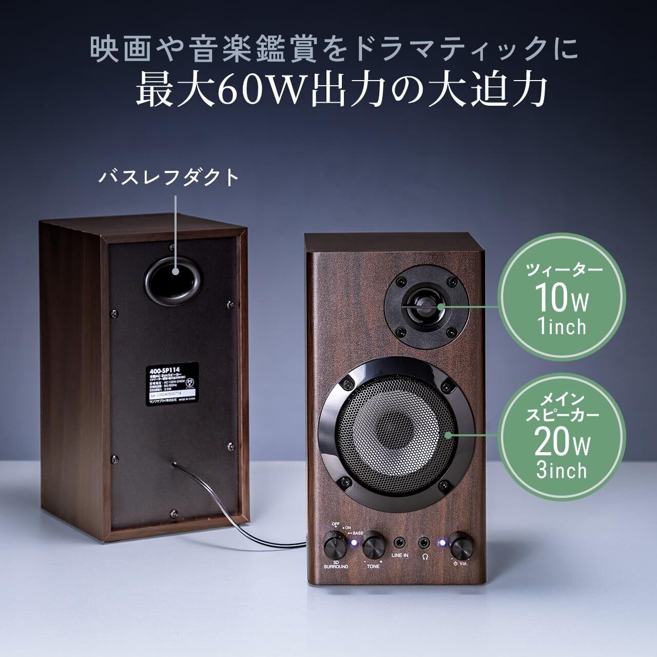 サンワダイレクト PCスピーカー 有線 3.5mm接続 木製 60W 高音調整可能 3Dサラウンド 木目調 AC電源 テレビ モニター パソコン用 400-SP114
