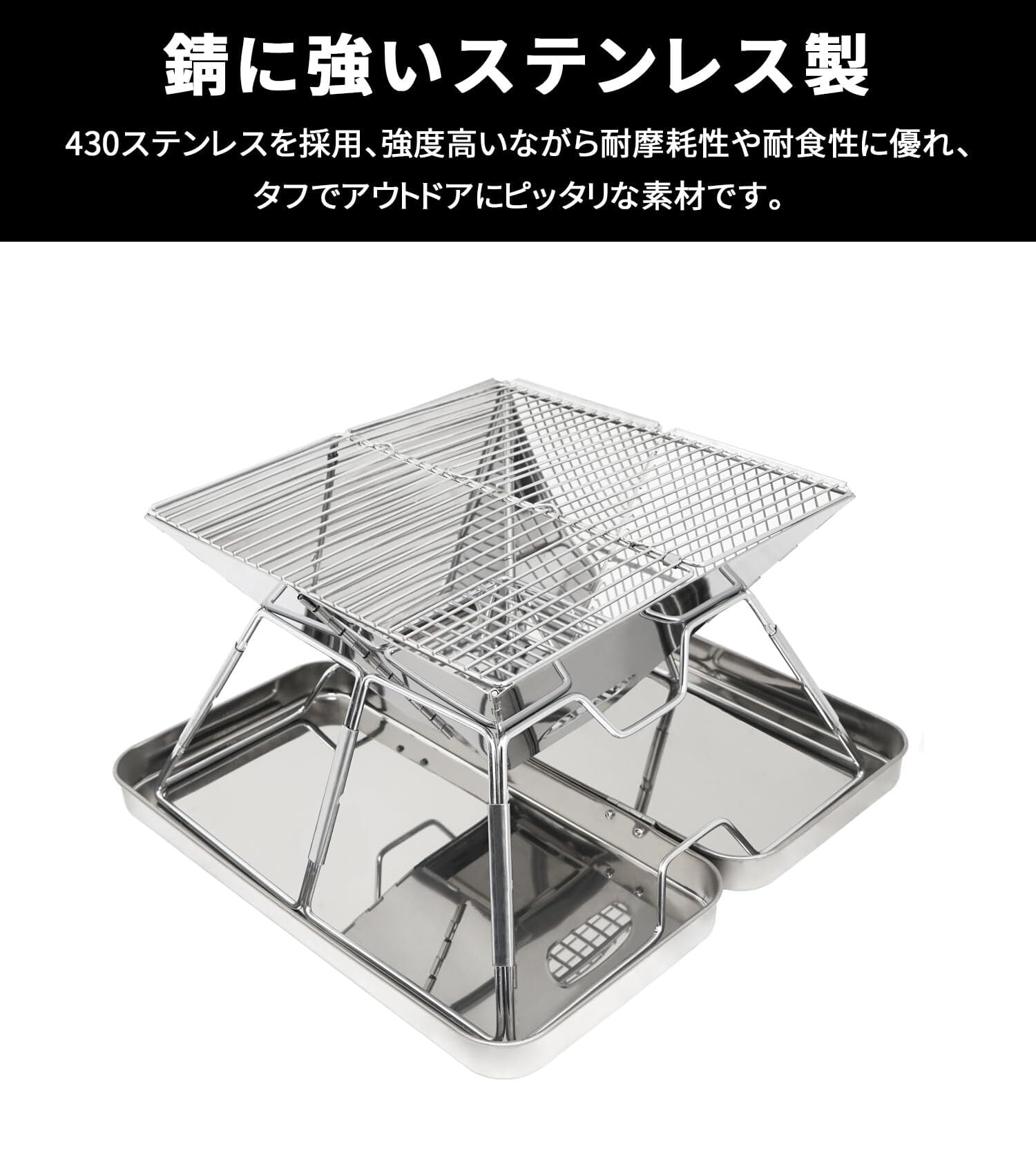 【仕様】 サイズ(展開時)39*38.5*22cm (収納時)41*21*7cm 焼き面積:30*30cm 重量:2.5kg 材質:本体/フレーム:430ステンレス 焼き網:201ステンレス