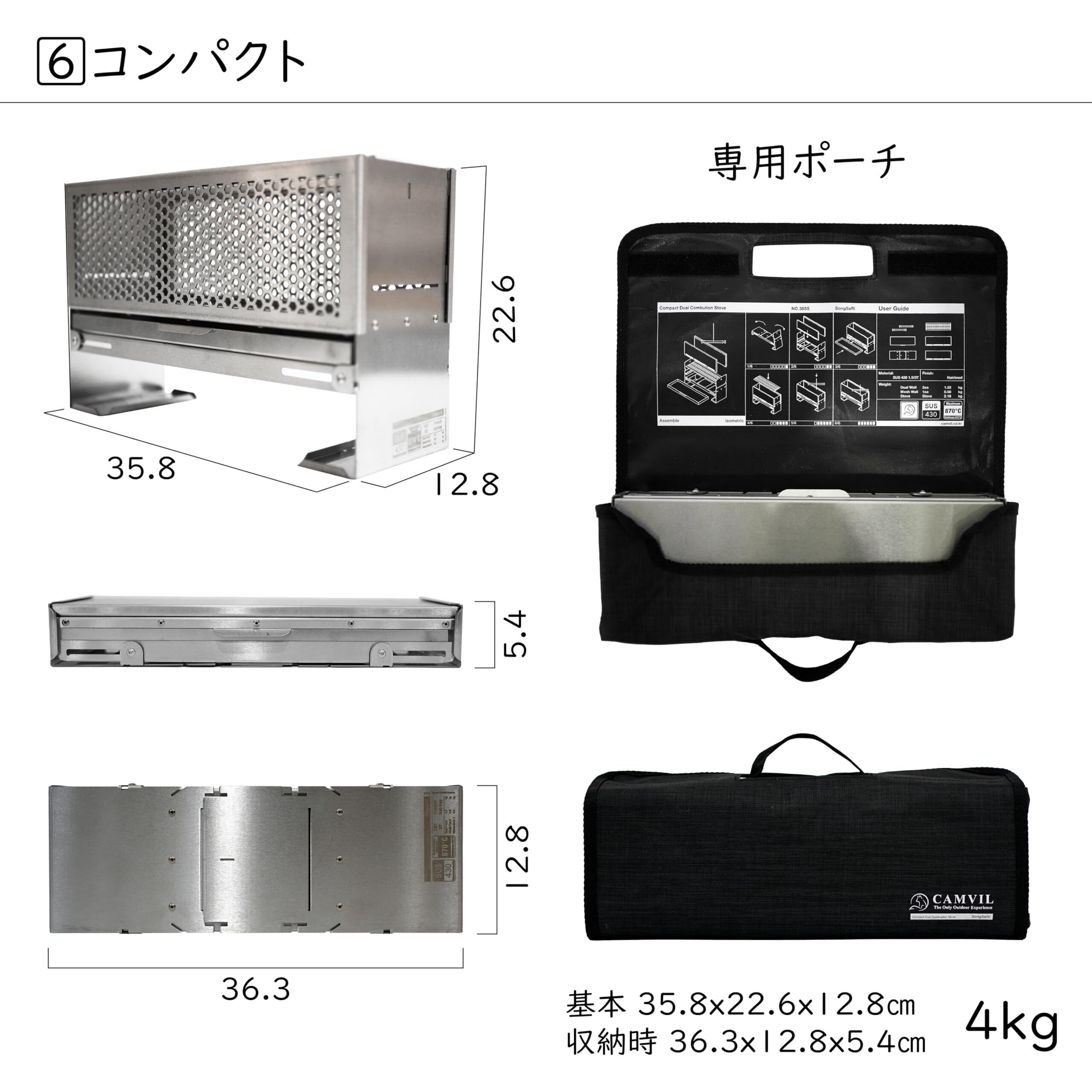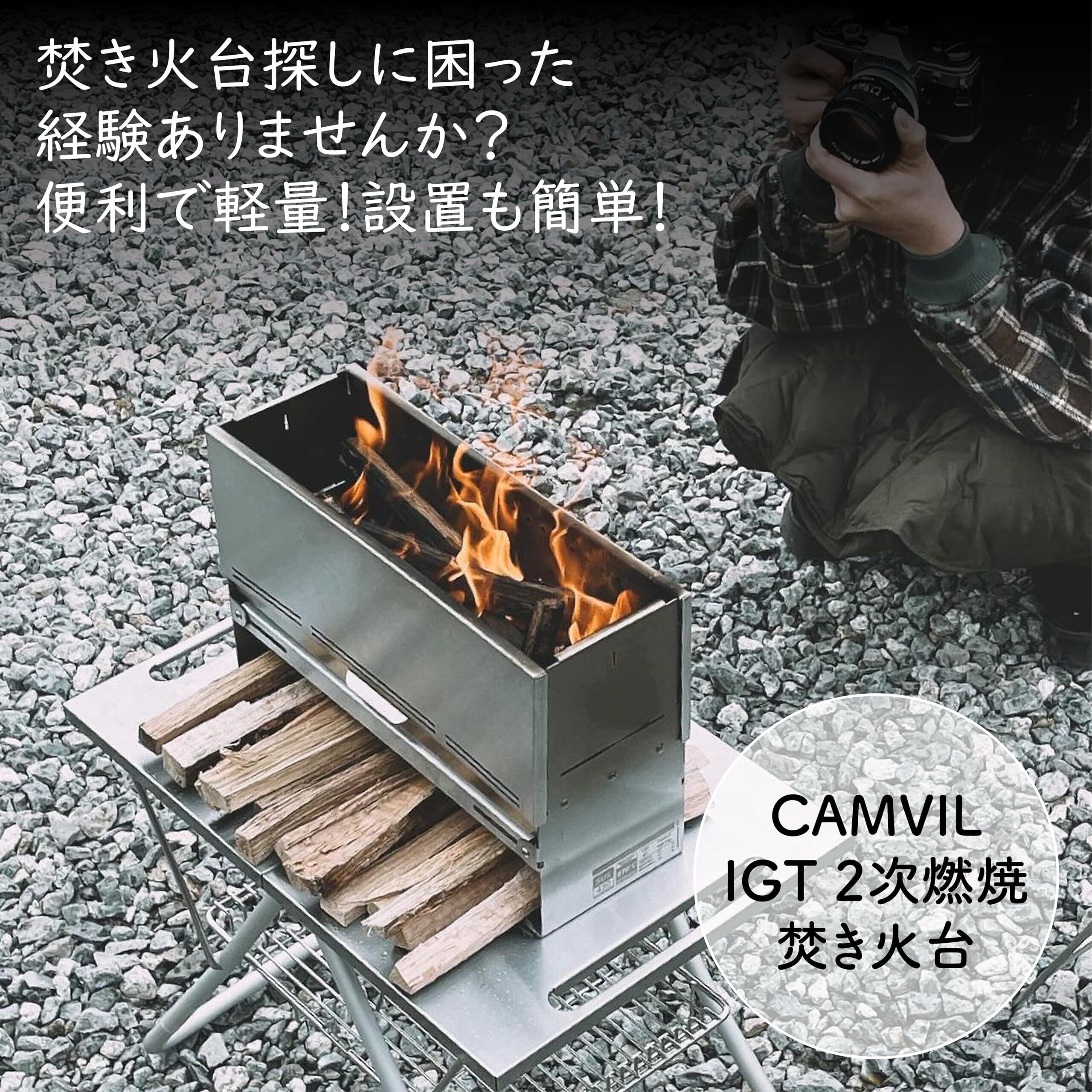 CAMVIL 二次燃焼 焚き火台 コンパクト折り畳み式 IGTテーブル互換 0.5単位薪ストーブ 収納袋とX字型ブラケット付き ステンレス ソロキャンプ アウトドアクッキング 迅速着火 (本体)