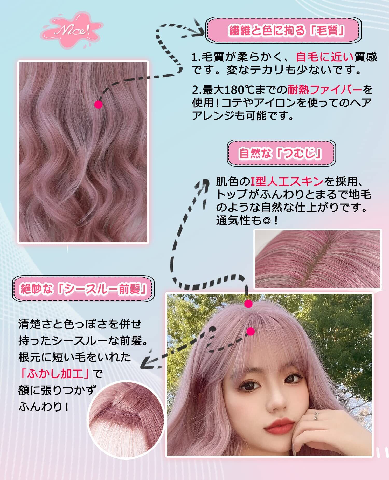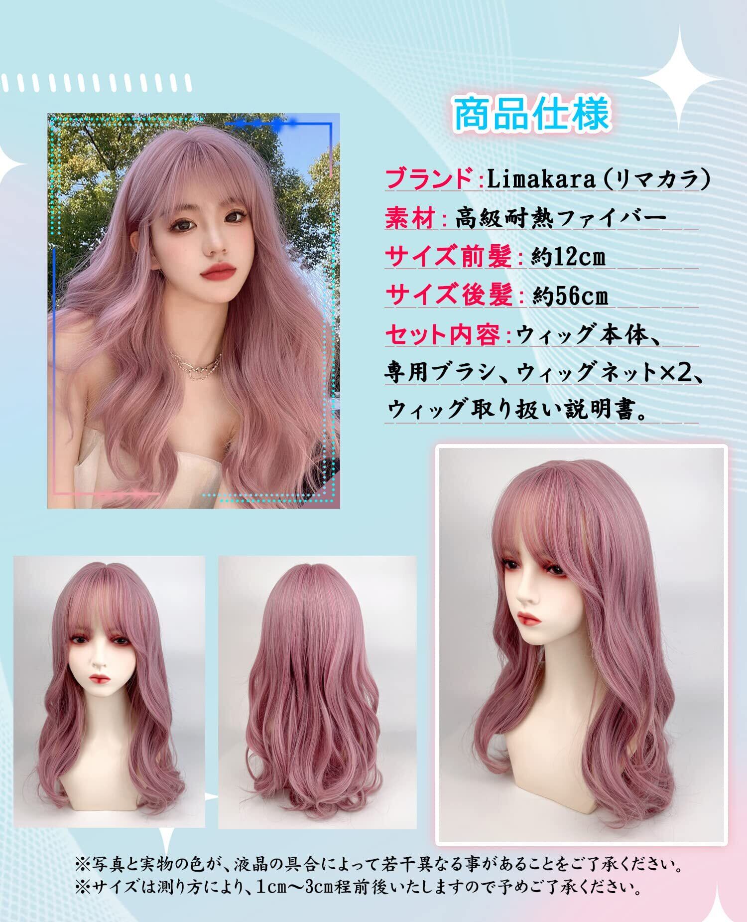 Limakaraウィッグ ロング 巻き髪 ピンク セミロング カール フルウィッグ かつら レディース コスプレ ギャル 自然 ぱっつん 原宿系 小顔 人気 耐熱 wig ファッション ネット/櫛付き ピンク | グランメゾンショップ