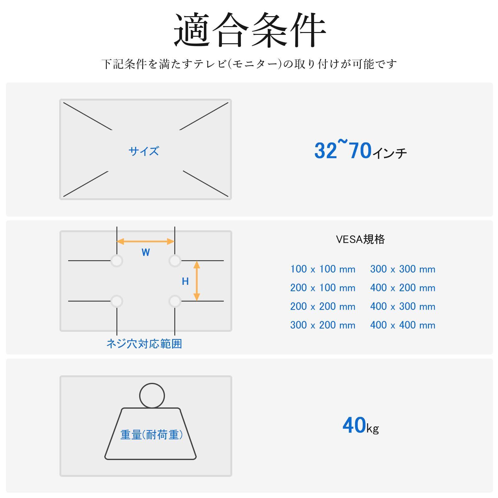 VESA規格対応:キャスター付きテレビスタンドのVESA (テレビ背面のネジ穴間の距離)対応最小限は10x10、最大限は40x40 cmです。32から70インチまでのほとんどなブランドテレビに対応できます。ご購入前にテレビのVESA、重量、サイズ仕様を必ずご確認ください。