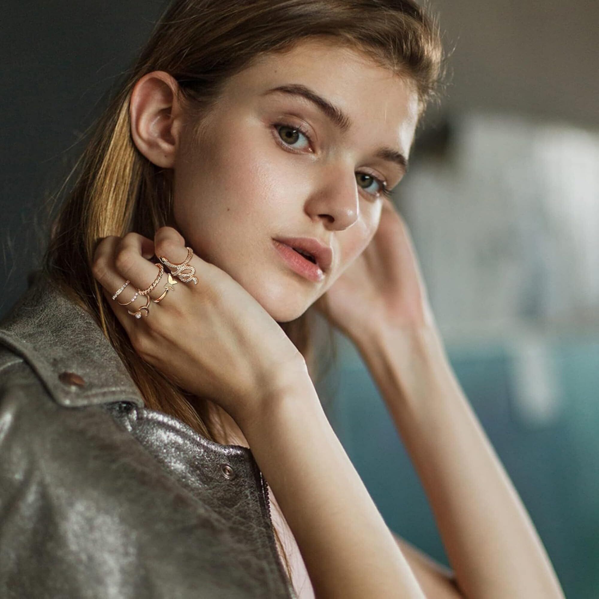 ヘビリング、バタフライリング、ツイストリング、クリスタルセットなど、様々なスタイルを組み合わせた30点のナックルリングが手に入ります。複数の積み重ね方が毎日あなたをユニークにします。お金に見合う価値があります。