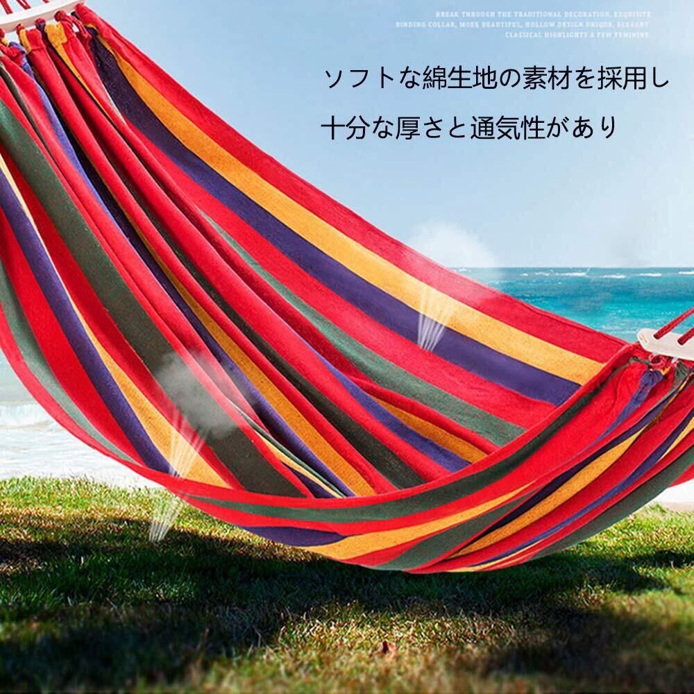【ハンモック・安心の素材】ソフトな綿生地の素材を採用し、十分な厚さと通気性があり、丈夫で破れにくい、ベッド部分の生地は寝転ぶのに十分な厚さと通気性があり、ロープは中太の紐を何本も;まとめて太くしていますので、体重を十分に支えられ問題なく利用できると思います。 (耐荷重内での利用に限ります)耐荷重はなんと300キロであります。キャンプ時に快適な寝心地が得られます;