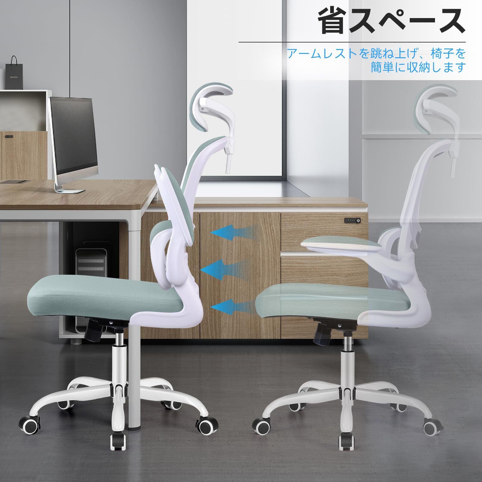【90°跳ね上げ式アームレスト】90度まで跳ね上げられるアームレスト、様々なニーズに対応します。椅子を使用しない時にスッキリと収納可能、省スペースです。アームレストを上げると胡坐をかいてギターでも引けます。