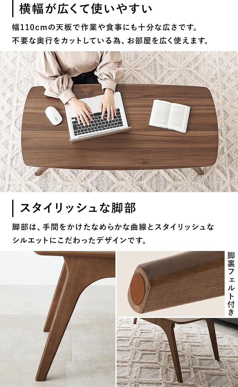 なめらかな曲線とスタイリッシュなシルエットにこだわった木目調のセンターテーブル。便利な引出しと取り外し可能棚付き。