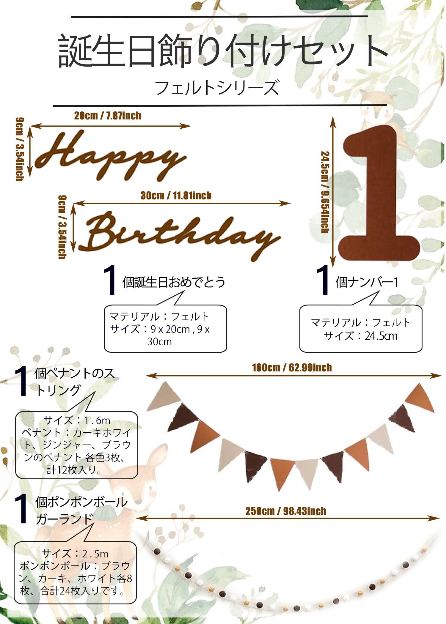 充実のセット内容 happy birthdayフェルト生地バナーx1、160cm フェルト生地フラッグガーランドx1、250cm フグボールガーランドx1。24.5cm 1歳の数字x1、質が高いですので、きちんと保存すれば、後にも持続に使用でき、コスパが高いです。
