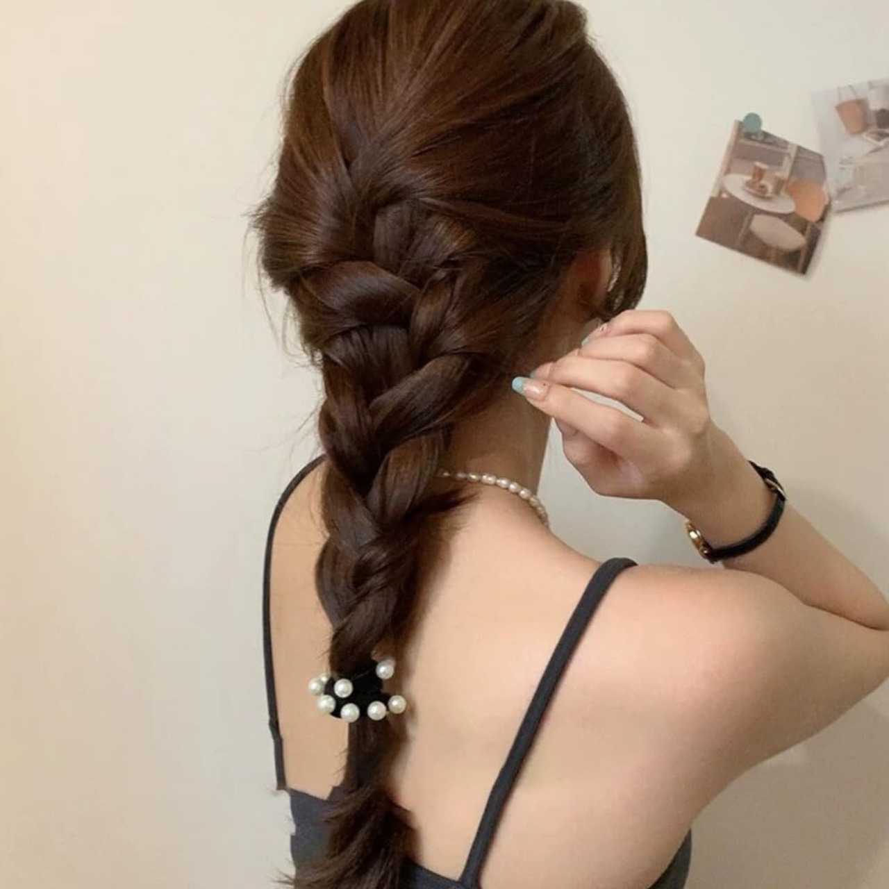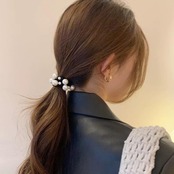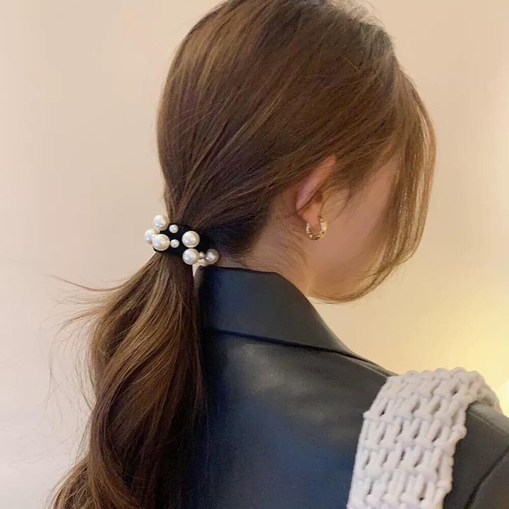 【映えるアレンジヘアが即完成】大きさの違うパールをランダムに散りばめたヘアゴム。まとめ髪に華やかさを添えてくれるからサッと結ぶだけでお洒落見え。