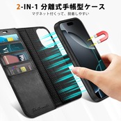 【2 in 1分離型&品質よい合皮】iPhone16プロマックス手帳ケースの背面には強力なマグネット搭載なので、インナーケースはいつでも自由に外すことができます。手帳型にも背面ケースにもなる便利な2in 1分離型ケースです。シーンに合わせてスマホ部分を取外して使用できます。表面に高級PU合皮を採用され、見た目も肌触りも良い、フィット感を与えられ、耐衝撃性も良い、落下時の衝撃を効率的によく吸収できます。背面カバーは品質よいな素材を採用され、滑りにくくて、指紋防止同時に高級感溢れる。
