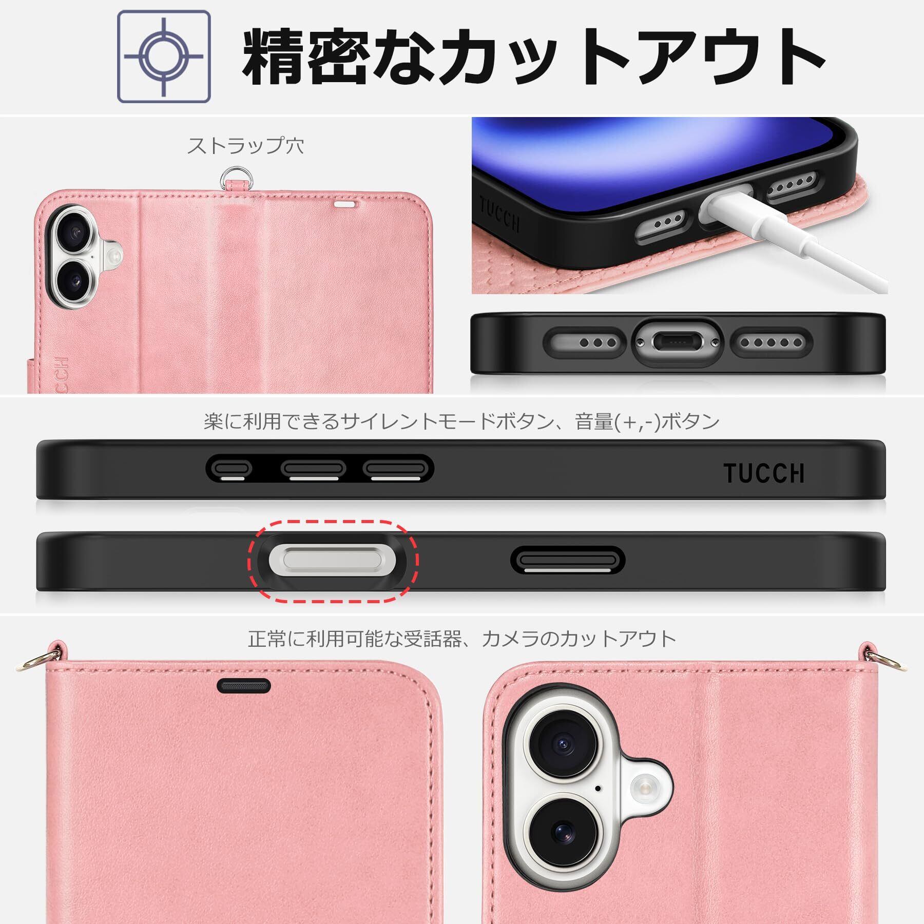 TUCCH iphone 16 対応 ケース 手帳型 ストラップ付き アイフォーン16手帳ケース 4つカードポケット付き [RFIDブロッキング] キックスタンド機能 TPU素材 PU合皮 全面保護 衝撃吸収 あいほん16カバー (2024年発売 6.1インチ iPhone 16 対応) ストラップ&ローズピンク | グランメゾンショップ