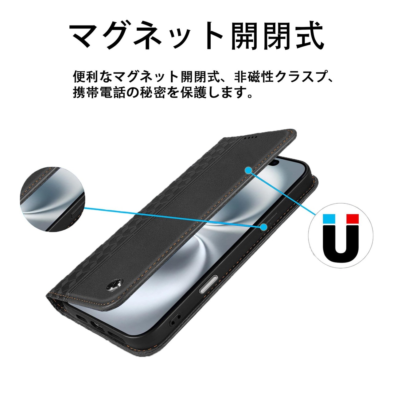 Gedurya iPhone 16 ケース 手帳型 アイフォン16 ケース iPhone 16 手帳型 ケース ひし形柄 iPhone16 ケース 手帳型 マグネット式 スタンド機能 iPhone 16 携帯カバー カード収納 財布型 iPhone 16 スマホケース 軽量 薄型 全面保護 耐衝撃 6.1インチ対応 - ブラック