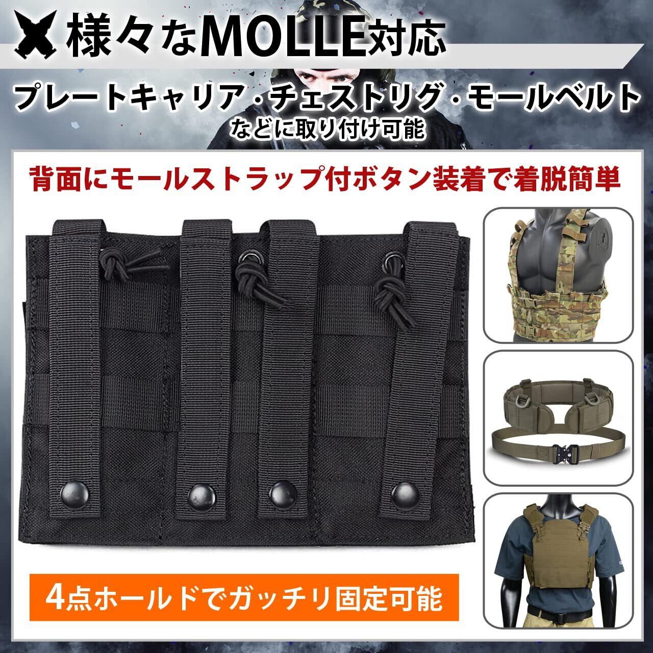 【MOLLE対応】背面にモールシステムを採用しておりプレートキャリア、チェストリグなどに取り付け可能。様々なカスタマイズをお楽しみいただけます。