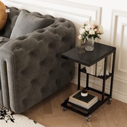 ZXD サイドテーブル ワゴン キャスター付きコの字型デザイン ベッド リビングサイドテーブル ソファ ブラックエンボス